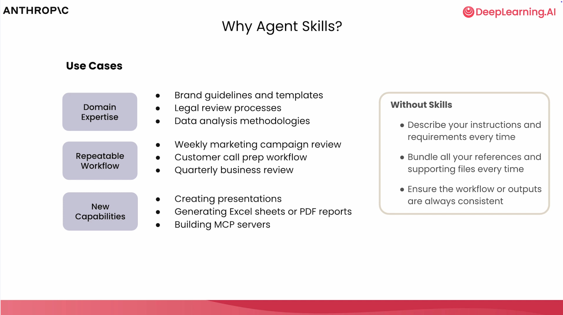 吴恩达老师在 DeepLearning.AI 平台推出的 agent-skills-with-anthropic 课程中文翻译(文字版)github.com/datawhalechina/agent-skills-with-anthropic该课程也适合非技术人员观看。本课程是 DeepLearning.AI 与 Anthropic 合作打造的 Agent Skills 专项课程在本课程中,我们将探讨 Skills 如何赋能 Claude 及其他 AI 智能体执行复杂任务。技能通过向智能体提供专门的指令和知识来扩展其能力。具体包括:1.理解 Skills 的工作原理2.掌握创建 Skills3. 构建适用于不同场景的 Skills(包括编程、研究、数据分析等)How I AI