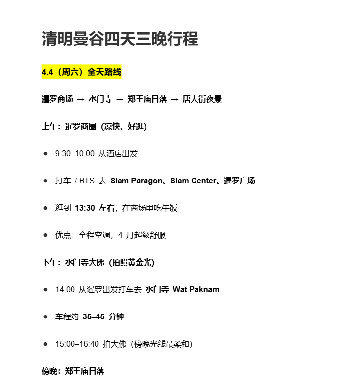明天去曼谷攻略还没做然后花了半个小时和豆包聊把所有时间安排都列出来了AI真的特别适合做旅游攻略比自己一个一个去收集快多了