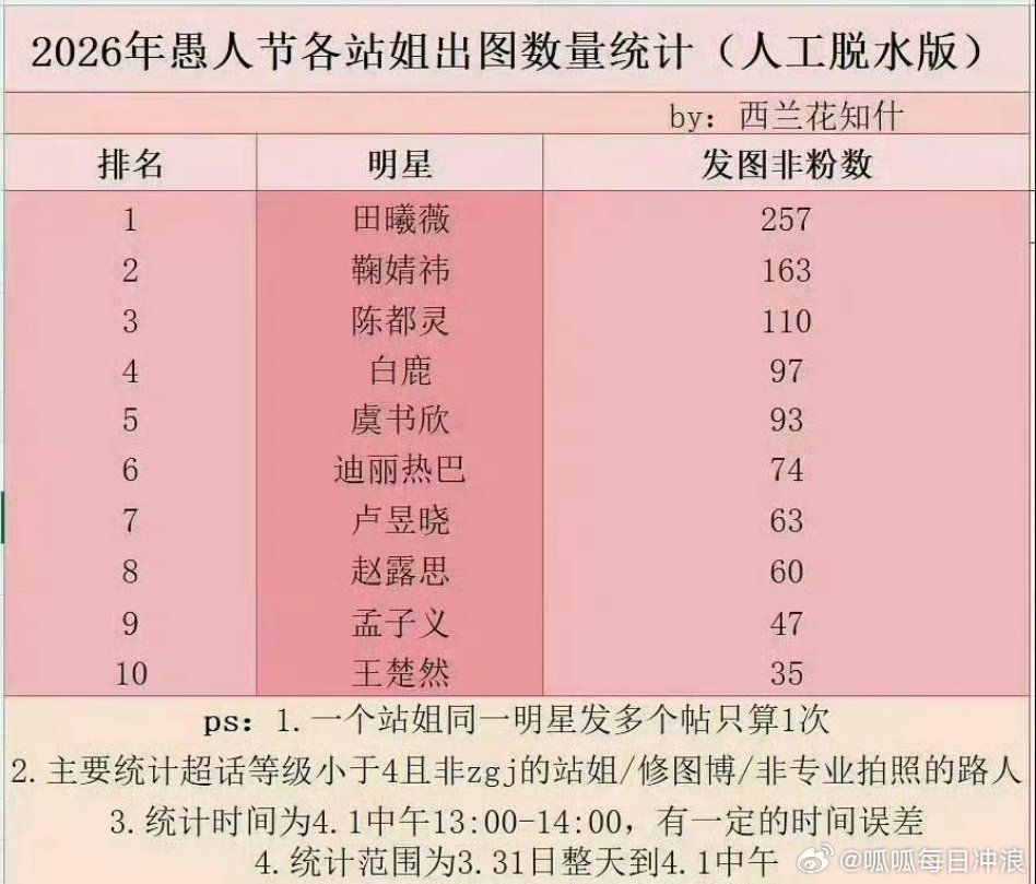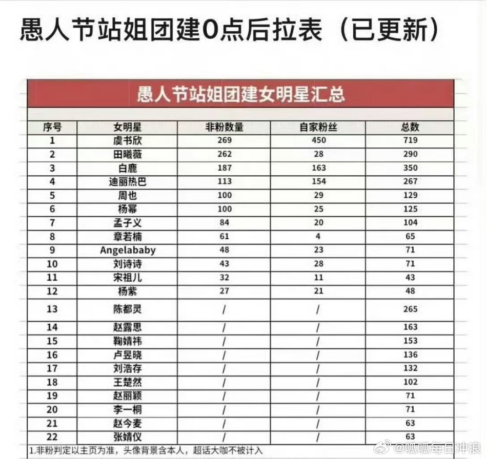 怎么愚人节站姐团建女明星第一有两版?一版是非粉田曦薇257第一鞠婧祎163第二,一版是非粉虞书欣269第一田曦薇262第二~ 到底哪个是真的