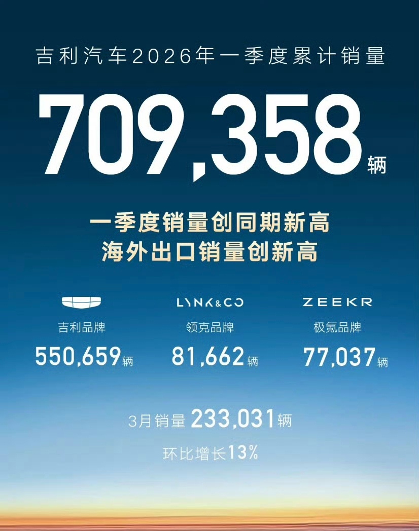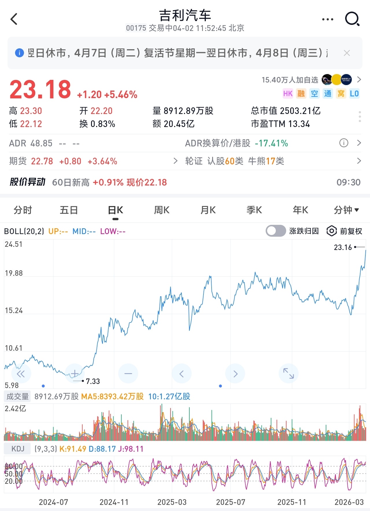 吉利最近真猛,就快新高了,虽然吧,第一季度是淡季,但市场只看销量,第一季度吉利拿了个第一,70.9万辆,股价近一月大涨近50%,股价创四年新高。我也看了下,极氪的销量,竟然是新势力第三,这你敢想?事实证明,低调过后依然能有增长,找到自己真正的对手和位置才重要。 吉利大涨
