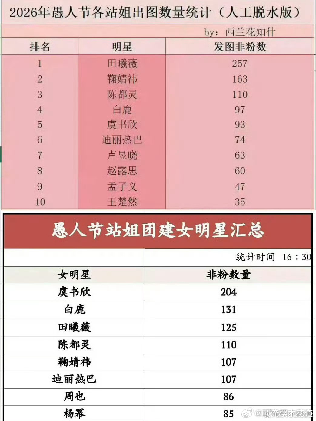 田曦薇愚人节站姐女星出图数量第一昨天确实刷到很多田曦薇的站姐发图,图一两张表没太看懂,到底谁最多?