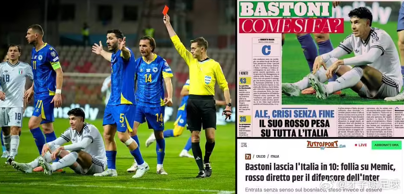 在世预赛欧洲区附加赛决赛中,意大利队点球大战不敌波黑,连续第三届无缘世界杯决赛圈。作为球队后防核心的巴斯托尼,赛后被推到了舆论的风口浪尖。这位巴萨在“左脚中卫”位置上的头号引援目标,在第41分钟因犯规被直接红牌罚下,导致球队在长达一个多小时的时间里少一人。尽管当时意大利1-0领先,但巴斯托尼的离场成为了比赛的转折点,蓝衣军团最终未能顶住波黑队的反扑,遗憾出局。