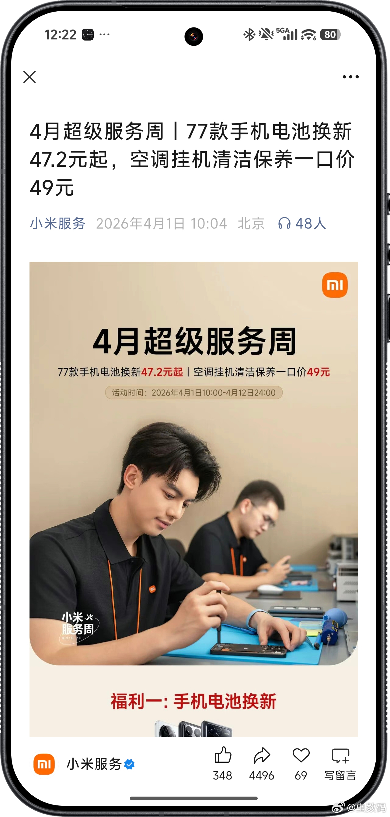 小米服务真诚奔赴小米米粉节售后活动来了,也叫4月超级服务周,这次的动作还是蛮大的,特别是8折换电池服务。