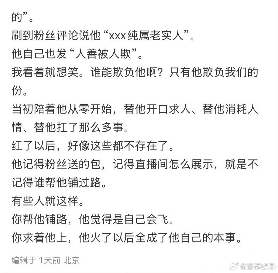 曝短剧男顶忘本刚刷到一个瓜,说短剧圈一个男顶流被前工作人员撕了。大意是人家当初帮他争取到男主机会,服装、品牌各种事都是团队在跑,结果他火了以后全归功给自己,直播说“工作都是我自己对接的”,还默许粉丝吹“人善被人欺”的卖惨人设。
