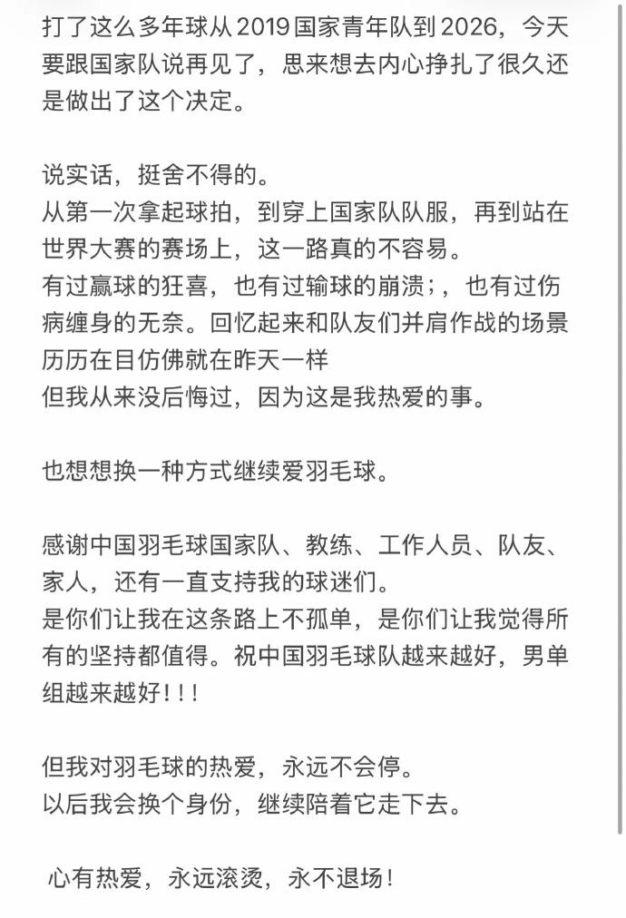 高昉洁和王正行官宣退役,发生了什么 虽然现在是羽毛球淡季,但国羽连续2名球员官宣退役,让球友有些摸不着头脑。先是高昉洁发布退役声明:与伤病抗争数年,亚锦赛成最后一舞。她曾在2019年遭遇跟腱断裂,后奇迹复出重返世界前十。因未能入选尤伯杯阵容,她选择在亚锦赛完成谢幕。那句“永不言弃”,是她留给赛场最后的注脚。 然后是王正行,现在还是被称男单小将,2002年出生,今年才24岁,正是当打之年,咋就退役了呢?不理解。之前就有传言说退役,看来不是空穴来风。他最好成绩是2025年的中国赛,以黑马身份首次打进决赛获得亚军(冠军石头)。