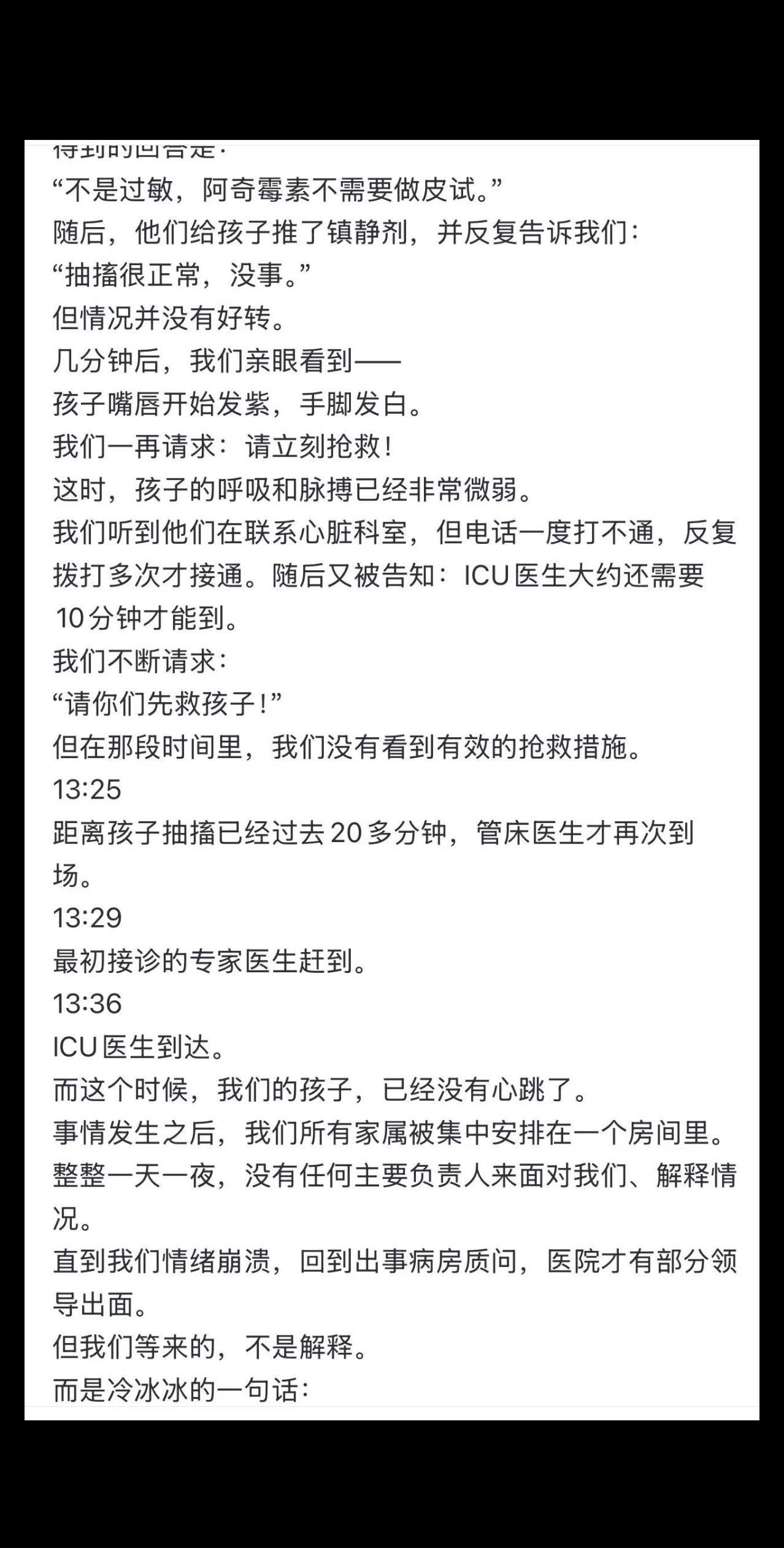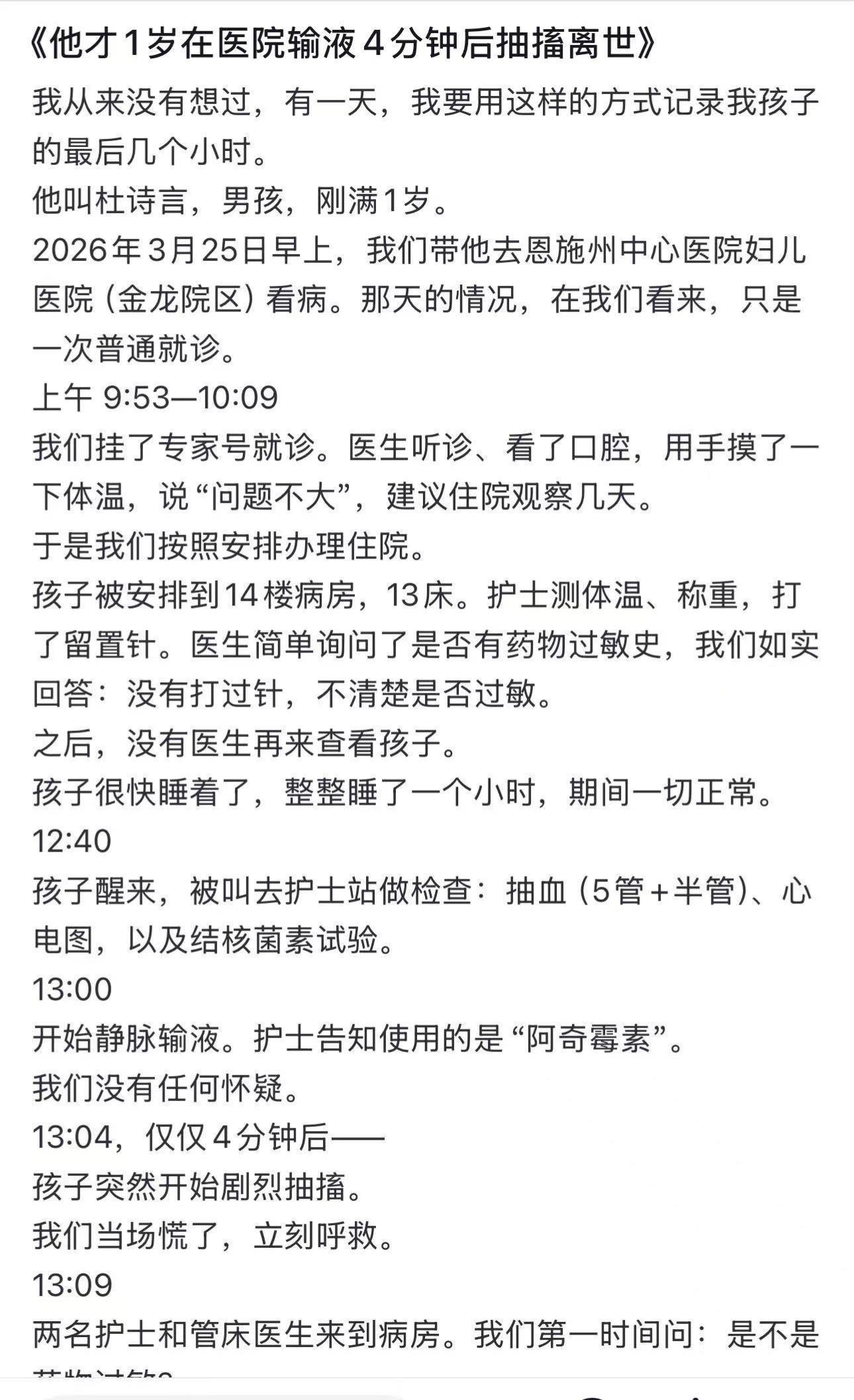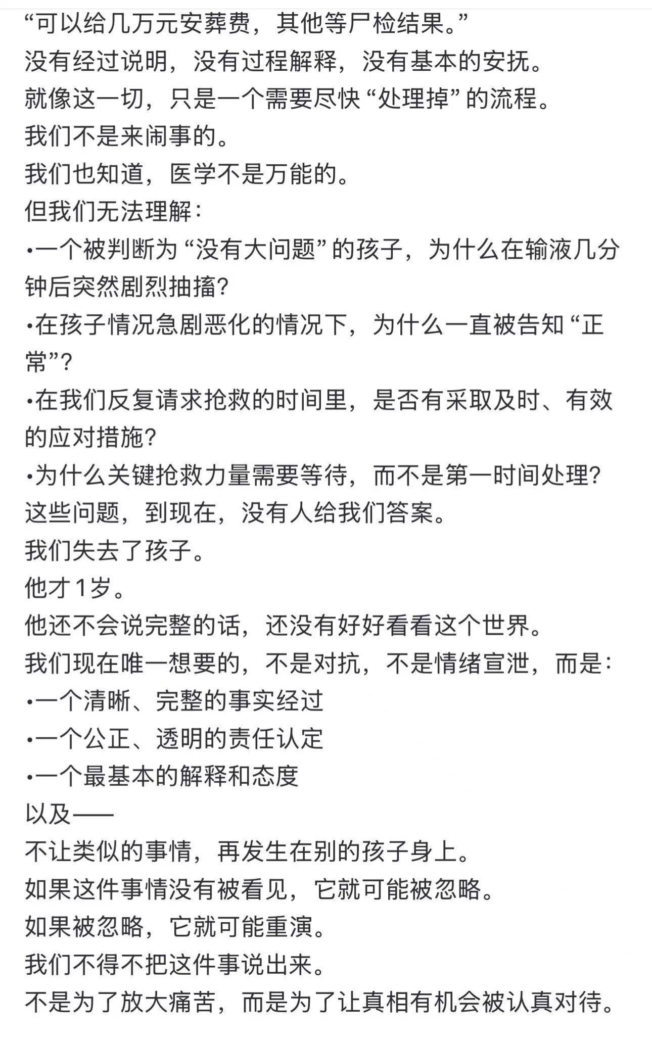 1岁男童输液后抽搐去世1岁男童输液4分钟后突发不适,却被告知抽搐很正常,还给注射了镇静剂,20多分钟后孩子离世。 孩子妈妈讲述刚满1岁的杜诗言,因普通就诊入院,输注阿奇霉素仅4分钟便剧烈抽搐。家长反复呼救,却被轻描淡写告知“正常”,抢救力量迟迟不到位,最终孩子失去心跳,这对父母只求:清晰的事实、公正的责任认定、不让悲剧重演。