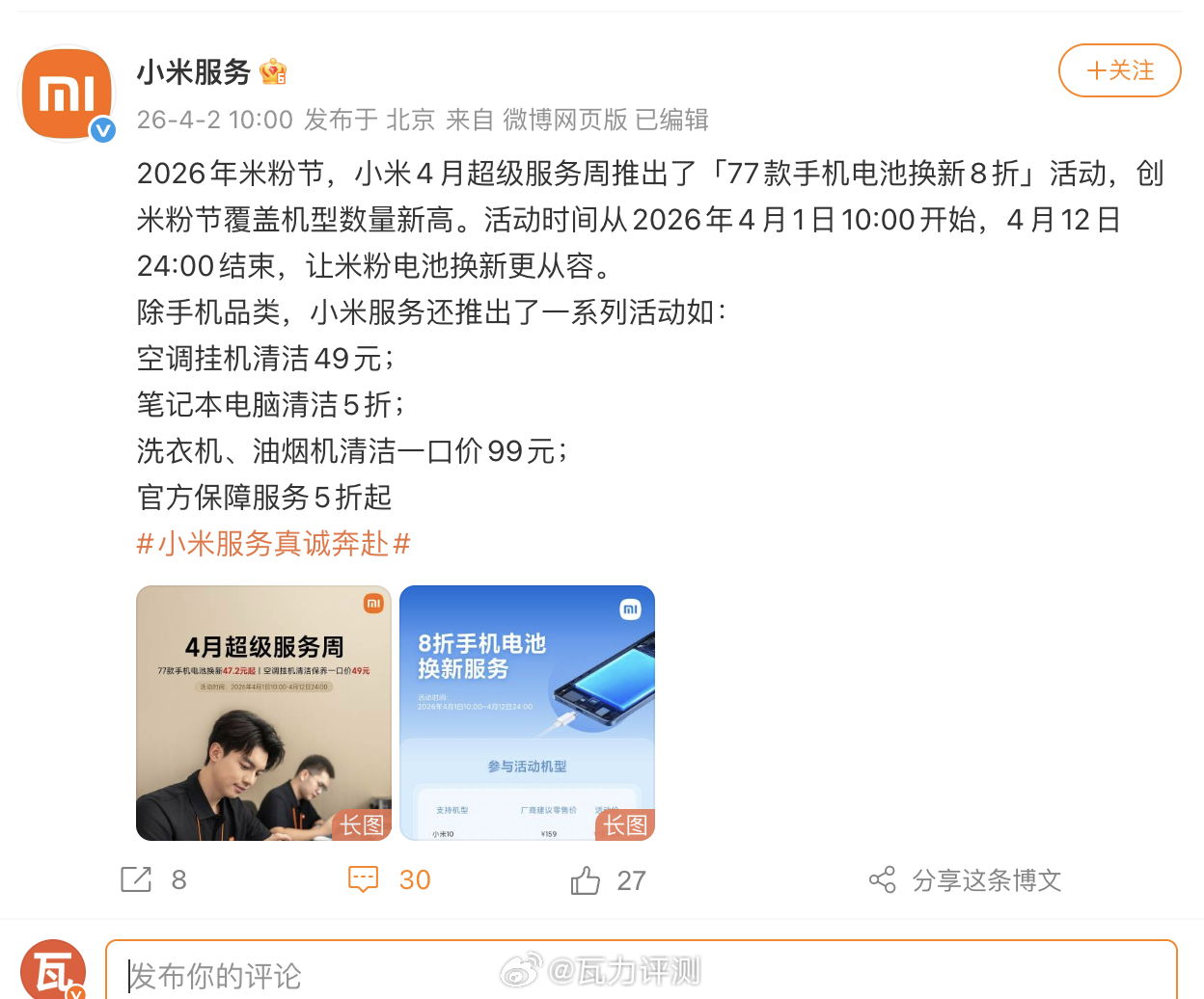 小米服务真诚奔赴小米这次直接给77款机器放出了8折换电池的福利~~~