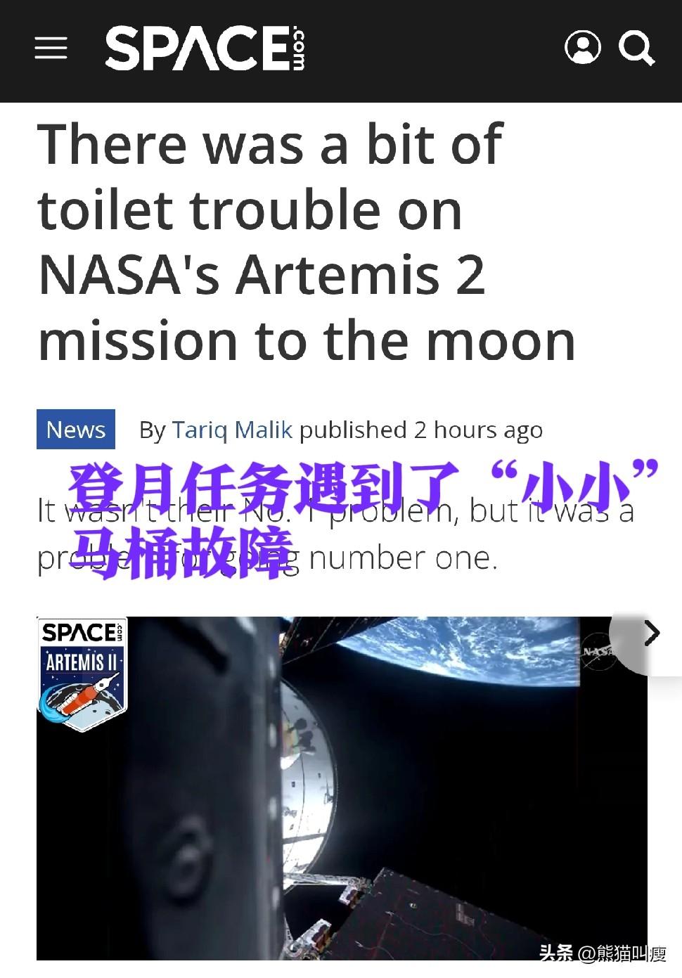 好消息:美国登月项目的阿尔忒弥斯2号(Artemis II)成功发射。 坏消息:四名宇航员正在排查船上唯一厕所出现的故障。 经过数小时的紧张抢修,中断的通讯恢复正常,厕所控制器和水箱阀门的异常情况也终于得到解决。 NASA飞行运行主管诺姆·奈特在肯尼迪航天中心解释了故障原因:马桶上的控制器问题造成的风扇停转。他们设法让宇航员钻到风扇的位置进行了检修。检修期间一名宇航员使用了紧急便便袋… 随后飞船又碰到了通讯中断,中继卫星又不好使了,也检查了个把小时。 对了,这次飞行任务,四名宇航员全部不登月。他们只是去月亮轨道上绕几圈。