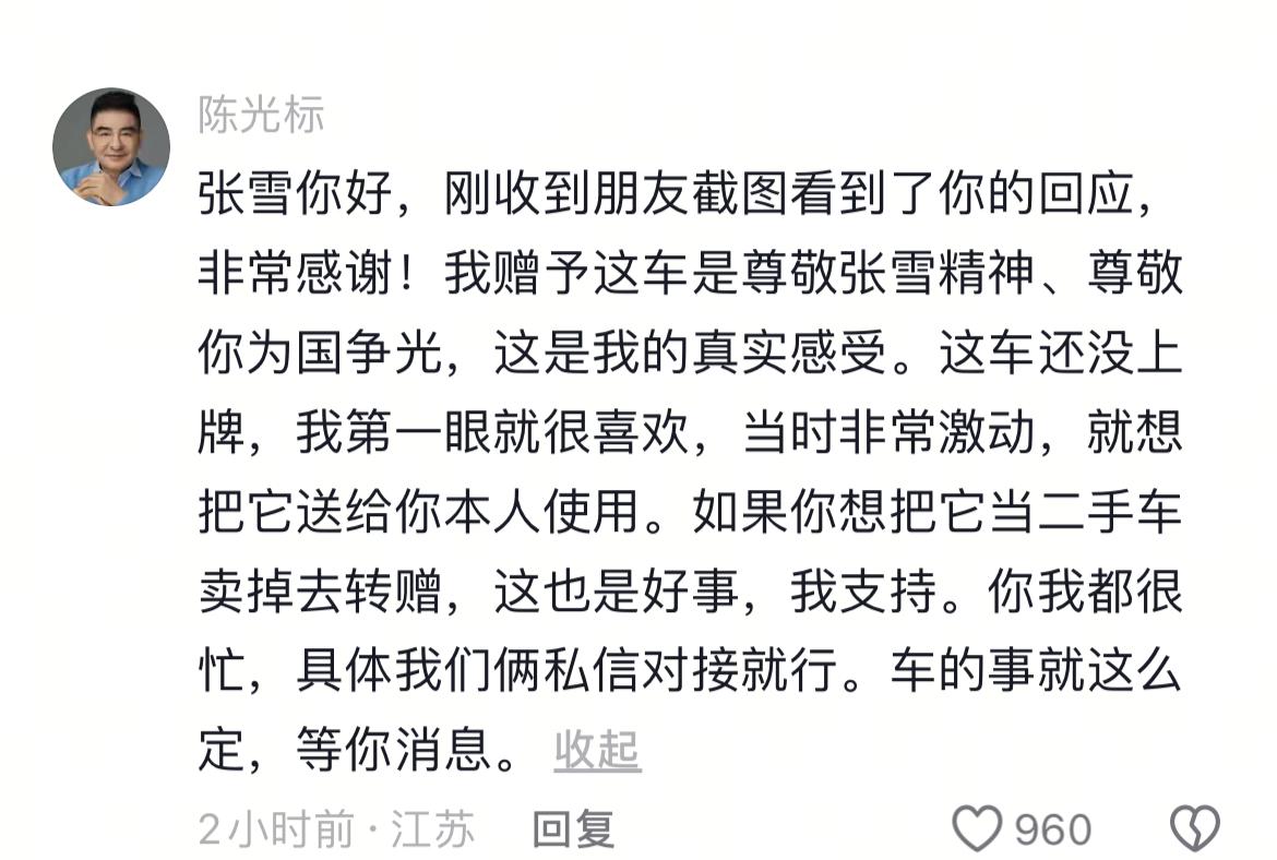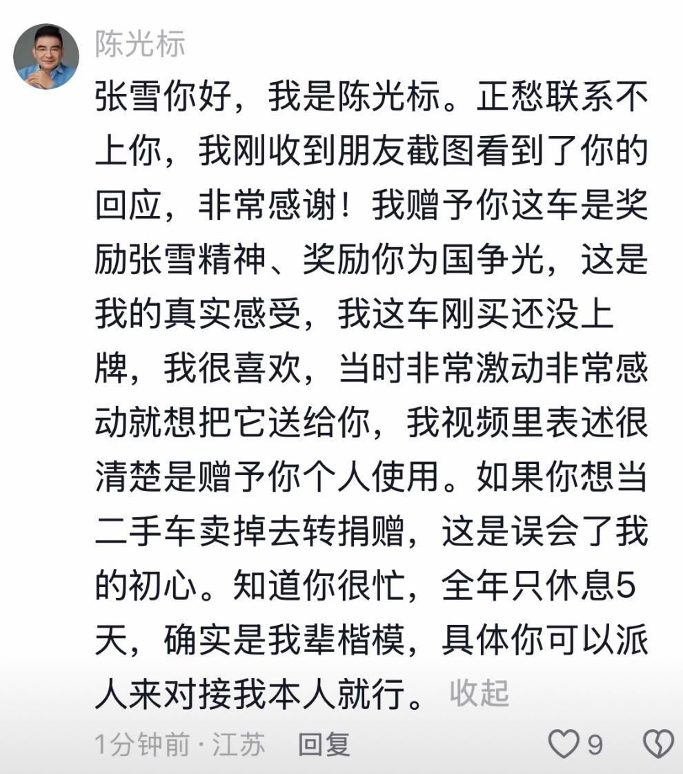 陈光标赠车态度反转:从“误会初心”到“全力支持” 陈光标赠予张雪劳斯莱斯幻影一事迎来了戏剧性后续,标哥的态度在短时间内经历了从“反对”到“支持”的180度大转弯。 起初,标哥在评论区直言不讳,强调赠车初衷是奖励张雪“个人使用”,认为若将车辆转卖捐赠是“误会了我的初心”。然而,这番表态并未维持太久。标哥迅速删除了原评论,并重新留言改口,态度180度转弯:“如果你想把它当二手车卖掉去转赠,这也是好事,我支持。” 隔壁桌同事:这一连串的操作,展现了标哥在舆论面前的灵活应变。[抠鼻]