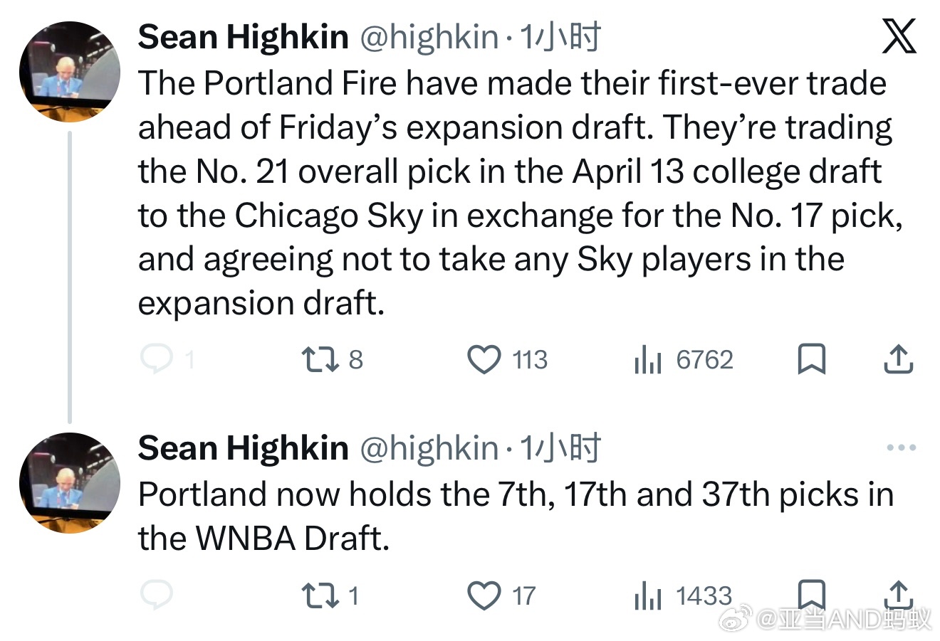 插播一条,WNBA新扩军的波特兰火焰队做了队史第一笔交易。用21号签换了芝加哥天空17号签,送出的是……在扩军选秀中不碰芝加哥天空的球员。