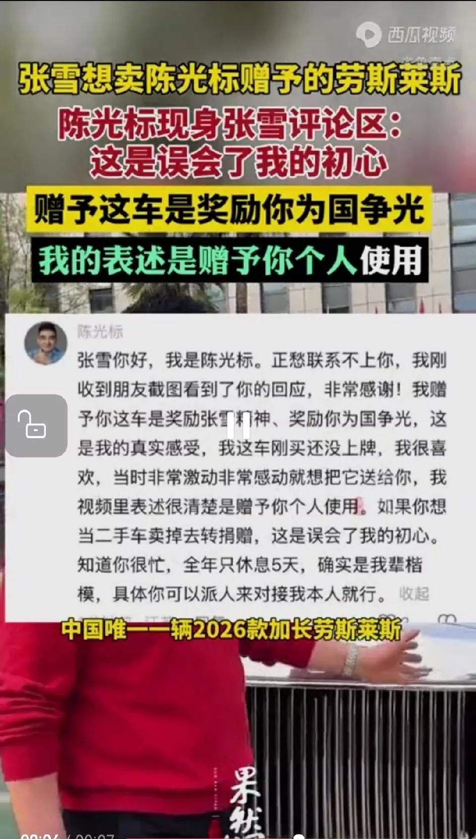 就冲陈光标赠送劳斯莱斯的理由,张雪也不会接受那辆车 两个人隔空互动只不过是按照传统礼节客气了,你好我也好 张雪回复说,我接受了,且找个二手车商八折八收车,钱我给嫣然天使基金。 意思已经很明确了:标哥,心意领了,车我不需要,要送就给更需要的嫣然天使基金吧 可能还有一层意思,张雪机车不是困难户,不需要帮扶也不需要“表彰”,况且陈光标不是上级