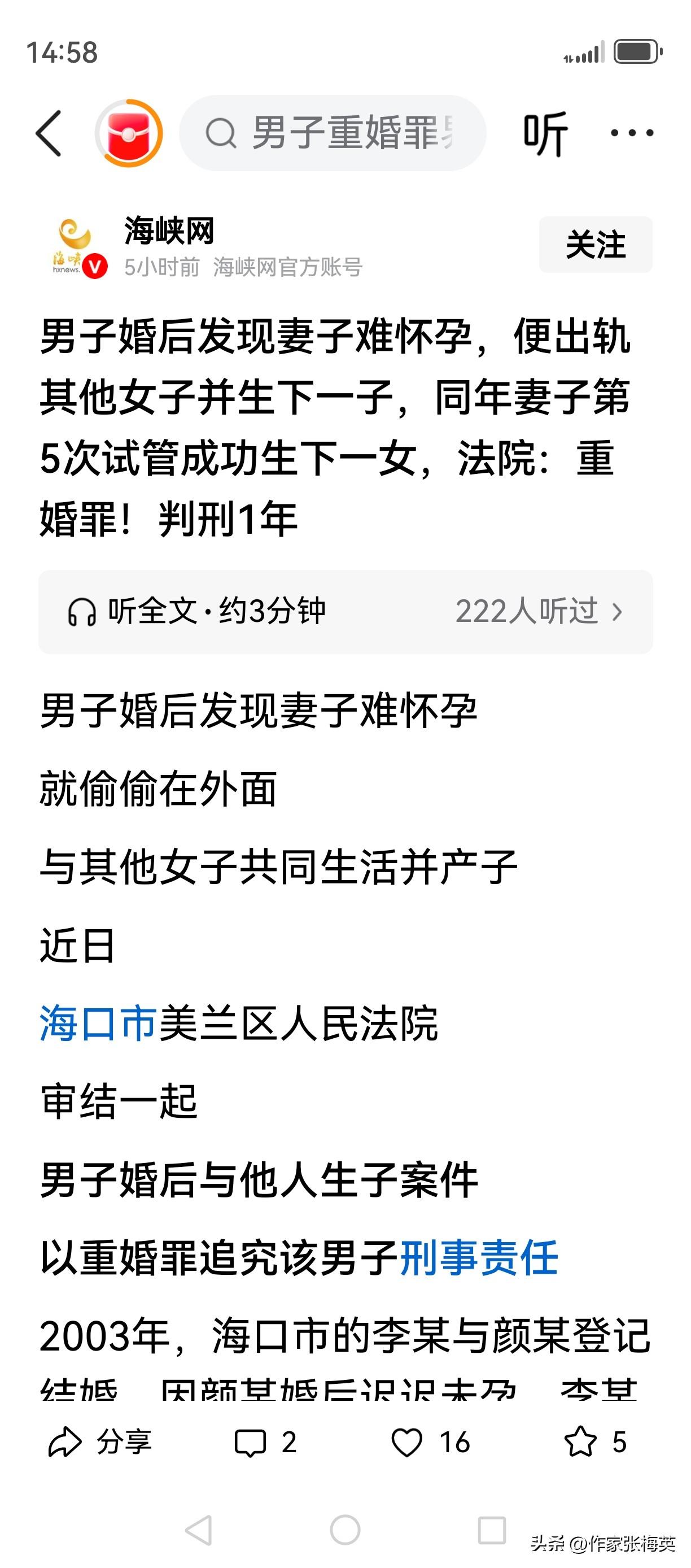 💔【男子嫌妻不孕偷养"外室"生子,没想到妻子第5次试管成功!法院:重婚罪,进去吧你!】 2003年,海口李某与颜某结婚。妻子迟迟未孕,李某陪做4次试管均失败。 2011年,李某出轨女子李某某。2012年初,小三怀孕;同年,妻子第5次试管终于成功! 10月,小三产子;12月,妻子诞下女儿。李某摊牌"更想和小三过",搬去同居十余年,偶尔才看亲生女儿。 2024年离婚时,妻子报案。法院认定重婚罪,判有期徒刑1年,缓刑1年半。 --- 🔥网友神评: "妻子第五次试管成功,他第四次出轨成功,这男的真'生育能力'爆棚" "四次试管失败没离婚,第五次成功了反而养小三?" "最惨是两个孩子,同父异母生日差俩月,以后怎么解释?" "缓刑等于没坐牢?重婚成本这么低?" "妻子试管五次才成功,他倒好,在外面'自然受孕'了" --- 💬短评:李某把生育当婚姻KPI,把忠诚当可选项。四次试管失败时妻子独自煎熬,第五次成功时他却已"另起炉灶"。法律给了他缓刑,但"重婚犯"标签和两个孩子的人生拷问,才是他真正的余生刑罚。婚姻从不是生育合作社,同甘共苦四个字,他终究不配。 重婚罪 试管婴儿 婚姻背叛 海口法院