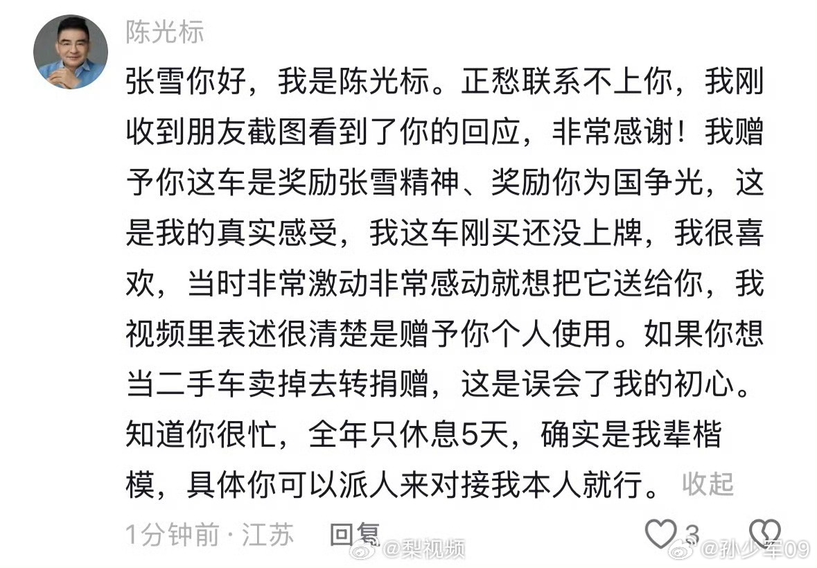 陈光标这个回复大家感觉怎么样陈光标回应张雪要卖车