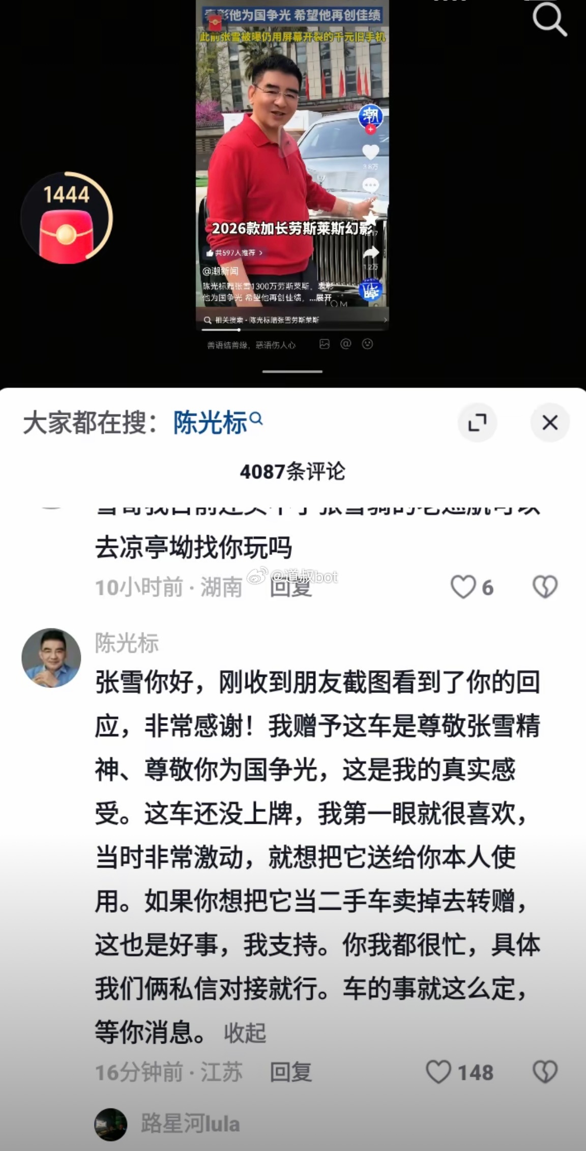 张雪想卖陈光标赠送豪车给嫣然捐款