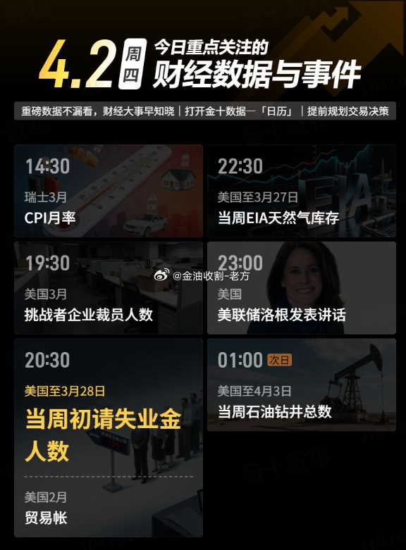 今日重点关注的财经数据与事件:2026年4月2日 周四① 14:30 瑞士3月CPI月率② 19:30 美国3月挑战者企业裁员人数③ 20:30 美国至3月28日当周初请失业金人数④ 20:30 美国2月贸易帐⑤ 22:30 美国至3月27日当周EIA天然气库存⑥ 22:15 美联储洛根发表讲话⑦ 次日01:00 美国至4月3日当周石油钻井总数