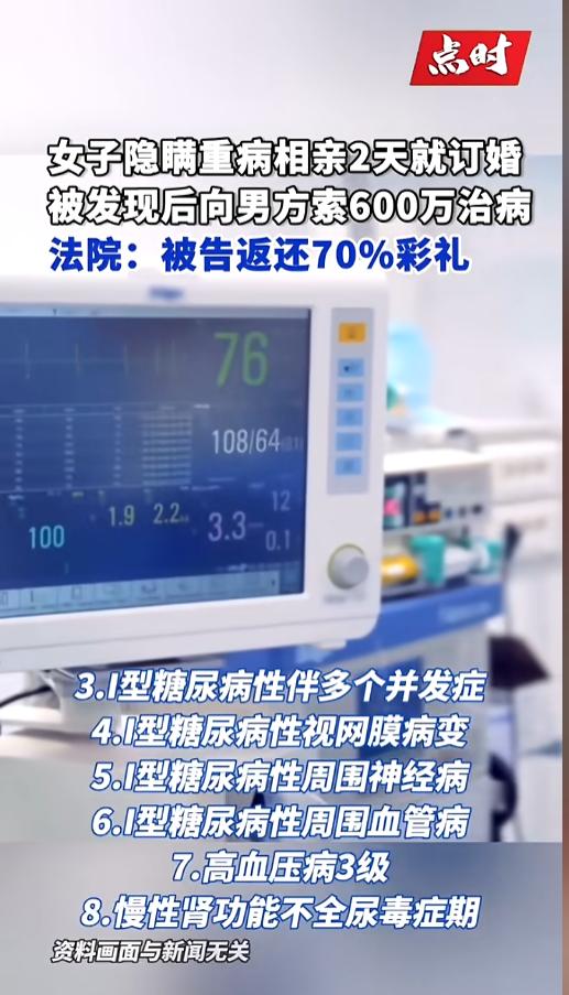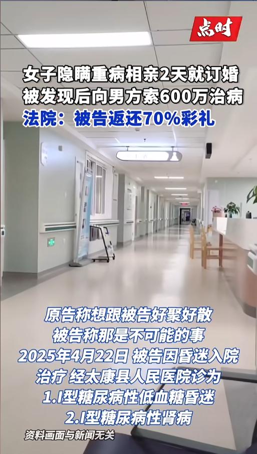 “电视剧都不敢这么演!”去年一月,河南周口,一男子相亲后仅两天就定了婚约,还付了20多万彩礼,当月就办了婚礼。可没想到,女方竟然一身的病,相亲时故意隐瞒了,还让男子贷款600万给她治病!男子一气之下告上了法院,法院判了! 谁都想要一个健康的伴侣,所以,为了能找到对象,有些人就偷偷隐瞒了自己患病的事实,可越是这样,双方感情破裂的也就越快,最后甚至对簿公堂。 2025年一月的时候,周先生经相亲认识了张女士,两天之后,双方就定了婚约,周先生彩礼加三金这些,一共给了20多万。当月,两个人就办了婚礼,但是却没去领证。 结果刚结婚没多久呢,周先生就得知,张女士患有一大堆病,他瞬间就不干了,觉得对方婚前故意隐瞒,这是在骗婚。没想到,对方竟还要求他贷款600万给自己治病。 周先生对此根本接受不了,找对方要求退还彩礼,结果人家说,这是不可能的事,你去起诉我吧。第二天,女方就因昏迷住了院。 医院诊断结果显示,女方患有糖尿病、尿毒症、高血压三级(极高危)、还有糖尿病引起的一系列并发症,光是重症就足足有8条!女方出院之后,直接把周先生给拉黑了,从此拒绝沟通。 无奈之下,周先生将对方告上了法院,要求退还全部彩礼。法院审理时,对方接了传唤也没有出庭,最后法院判决:返还70%的彩礼,也就是16.66万。 网友看后表示,闪婚要不得,里面的危险因素太多了。到时候随便一条,自己就是人财两空!找对象可千万得擦亮眼睛! 信息来源:《女子瞒重病订婚向男友索600万治病》点时新闻
