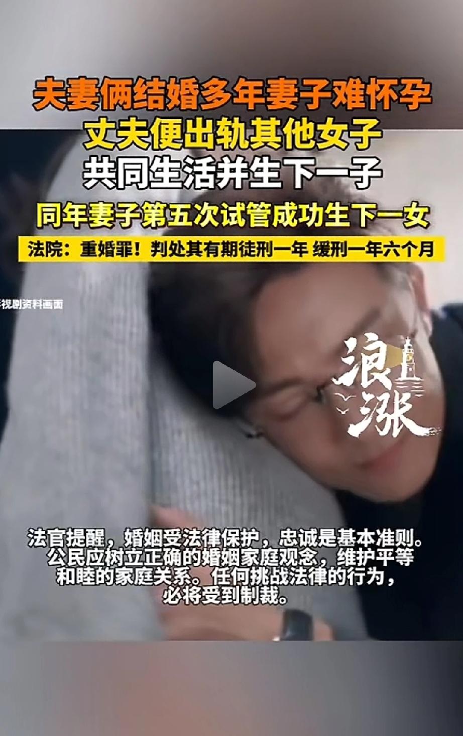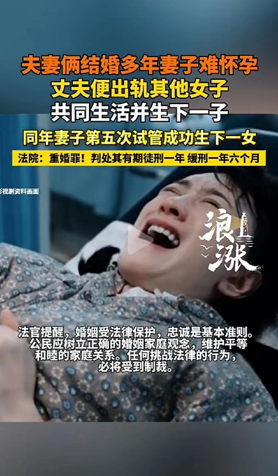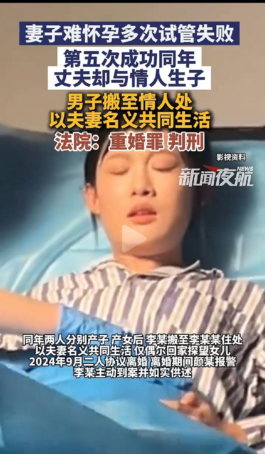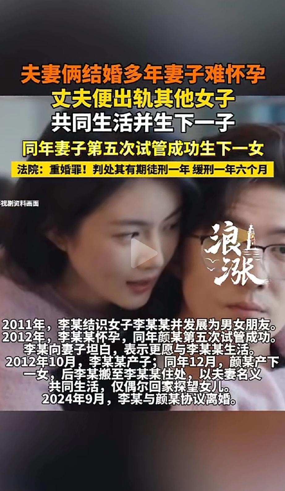 丧良心!海南海口,一对夫妻结婚20多年。老婆为了生孩子,做了5次试管。没成想在妻子为了生孩子受尽折磨,丈夫却在她最艰难的时候出轨,还生了一个儿子。更气人的是,他居然跟情人以夫妻名义一起住了12年! 2003年,海南海口的李某和妻子颜某登记结婚。两个人感情不错,但有一个大难题:一直要不上孩子。 为了有个自己的孩子,夫妻俩决定做试管婴儿。前后做了4次,全失败了。那段时间,李某在别人眼里算是个好老公,经常陪着老婆四处求医,一趟趟往医院跑。 表面上看,这个家还在往前走。可谁也没想到,就在老婆拿自己的身体一次一次去赌一个孩子的时候,这段婚姻的底色早就变了 2011年,李某在外面认识了另一个女人李某某。两个人很快发展成男女朋友关系。 2012年初,情人怀孕了。巧的是在同一年,颜女士的第5次试管婴儿手术也成功了! 2012年10月,情人生下一个儿子。仅仅两个月后,颜女士也生下了自己的女儿。 也就是说:老婆在手术台上忍着剧痛,拼命想给这个家带来一个孩子的时候,老公的另外一个孩子也倒计时了。 更过分的是,情人那边生完孩子后,李某直接搬过去跟她一起住。这一住,就是12年! 他把情人那边当成了实实在在过日子的家,而老婆这边呢?他只是偶尔回去看看女儿。 直到2024年9月,两个人才协议离婚。随后,颜女士选择了报警。 法院最终判决:李某犯重婚罪,有期徒刑一年,缓刑一年六个月。 一位网友直接点出核心:“虽然判了但对于他老婆来说太轻了,男人付出的代价太低了,一年还缓刑一年半,可能最后根本进不去,犯罪成本太低了。” 为什么大家觉得一年半缓刑太轻?咱们算两笔账: 第一笔欺骗了妻子12年。4380天。最后惩罚是“缓刑一年半”,而且大概率不用坐牢。平均下来,每欺骗一天,只换来不到一个小时的“名义惩罚”。 第二笔妻子做了5次试管,身体遭了多少罪?打针、取卵、卧床、激素紊乱……这些痛苦换来的,是丈夫在外面跟别人过日子。这种伤害,用一年缓刑来赔,公平吗? 李某不爱了,明明有无数次机会可以叫停——可以离婚,可以坦白,甚至可以让老婆及时止损。 他算的太精了!把老婆当备胎,万一情人那边不靠谱呢?他至少还有一个愿意给他做试管的老婆 正如网友说:“最可恨的不是他变心,是他明明不爱了,还拖着妻子,让她在希望和失望里反复煎熬,耗尽了青春。” 颜某,为了要个自己的孩子,促排卵针天天打,一针下去肚子又酸又胀。 取卵的时候,哪怕有麻醉,术后那种坠胀和疼痛感,就像无数根针同时扎进卵巢。 移植完还要卧床半个月,翻个身都要小心翼翼。这个女人不是不知道疼,也不是不知道苦。 她只是觉得:只要有了孩子,这个家就能保住,老公就能回心转意。可最后换来的是被骗12年。 就像网友感慨:“别把生孩子当成婚姻的全部,一个男人真的爱你,不会让你独自承受这些苦,更不会背叛你。” 可我想说:孩子从来都不是婚姻的救命稻草,你可以不爱,但请别伤害。玩弄感情的人,终究会被感情所累。法律的账、良心的账,迟早都要还。