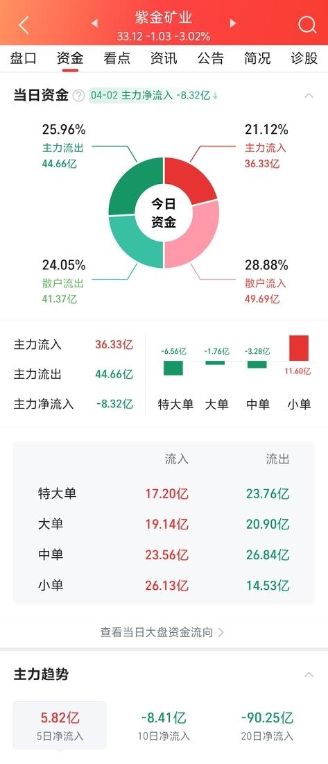 紫金矿业4月2日资金面全解析:主力出逃、散户接盘,短期承压但长期逻辑仍在 一、当日核心数据速览(4月2日) - 股价表现:收盘价33.12元,当日下跌1.03元,跌幅3.02%,全天走弱。 - 资金全景: - 主力资金:净流入-8.32亿元(净流出),其中主力流入36.33亿,流出44.66亿,净流出规模较大。 - 散户资金:净流入8.55亿元(散户流入49.69亿,流出41.37亿),呈现明显的主力出逃、散户接盘格局。 - 分单明细: - 特大单:净流出6.56亿(流入17.20亿,流出23.76亿) - 大单:净流出1.76亿(流入19.14亿,流出20.90亿) - 中单:净流出3.28亿(流入23.56亿,流出26.84亿) - 小单:净流入11.60亿(流入26.13亿,流出14.53亿) → 超大单、大单、中单全线下净流出,仅小单(散户)大幅净流入,资金结构非常清晰。 二、中期资金趋势:短期反弹后再度走弱 从主力趋势来看: - 5日净流入:5.82亿元(短期有资金回流,带来了一波小反弹) - 10日净流入:-8.41亿元(中期资金仍在流出) - 20日净流入:-90.25亿元(近一个月主力资金大幅出逃,累计净流出超90亿) - 近5个交易日资金走势:3月27日+5.42亿 → 3月28日-0.03亿 → 3月31日-1.07亿 → 4月1日+10.14亿 → 4月2日-8.32亿 → 说明4月1日的反弹是短期脉冲式资金流入,4月2日主力资金再度大幅出逃,反弹动能快速衰竭,短期资金面偏空。 三、融资融券数据:杠杆资金也在撤退 - 4月1日融资净买入:-9363.91万元(环比-267.29%,杠杆资金大幅卖出) - 融资余额占成交额比:-0.85%,杠杆资金参与度持续下降 - 中期融资趋势: - 5日净买入:-3613.86万 - 10日净买入:-7.83亿 - 20日净买入:-12.31亿 - 60日净买入:42.86亿(长期仍有杠杆资金布局,但短期持续撤退) → 融资资金的持续净卖出,说明短线杠杆资金对短期走势信心不足,进一步压制股价。 四、核心逻辑拆解(大白话版) 1. 为什么今天跌?资金面直接给答案 - 主力资金砸盘:超大单+大单单日合计净流出超8.3亿,机构、大户在集中卖出,是股价下跌的核心动力。 - 散户接盘:小单净流入11.6亿,散户在股价下跌时进场抄底,形成了典型的“主力出货、散户接盘”的弱势格局。 - 中期资金不支撑:20日净流出超90亿,说明近一个月主力一直在持续减仓,短期反弹没有改变中期资金流出的趋势。 2. 短期走势怎么看? - 压力:主力资金大幅出逃、杠杆资金撤退、散户接盘,短期股价缺乏上行动力,大概率延续震荡调整,33元附近支撑较弱,下方考验30-32元区间。 - 机会:5日资金仍有净流入,说明有部分资金在博弈反弹,但持续性存疑,不建议散户盲目抄底。 3. 长期逻辑还在吗? 紫金矿业作为国内矿业龙头,铜、金等核心矿产资源储量丰富,长期受益于全球新能源(铜需求)、避险(黄金需求)的大趋势,长期基本面没有问题。 本次资金流出更多是短期市场情绪、板块轮动导致的资金调仓,而非公司基本面恶化,长期投资者可以忽略短期波动,关注公司矿产产量、业绩兑现情况。 五、给普通投资者的操作建议 1. 短线投资者:主力资金大幅出逃,短期风险较高,建议观望为主,不要盲目抄底,等待资金面企稳(主力净流入持续为正)再考虑进场。 2. 中线投资者:中期资金仍在流出,建议控制仓位,逢高减仓,规避短期调整风险,等待20日资金回流再布局。 3. 长线投资者:公司长期逻辑不变,短期调整是正常波动,可以逢低分批布局,长期持有吃业绩增长和分红。 4. 风险提示:股市有风险,投资需谨慎,以上分析仅基于资金面数据,不构成任何投资建议,投资者需自主决策、自担风险。