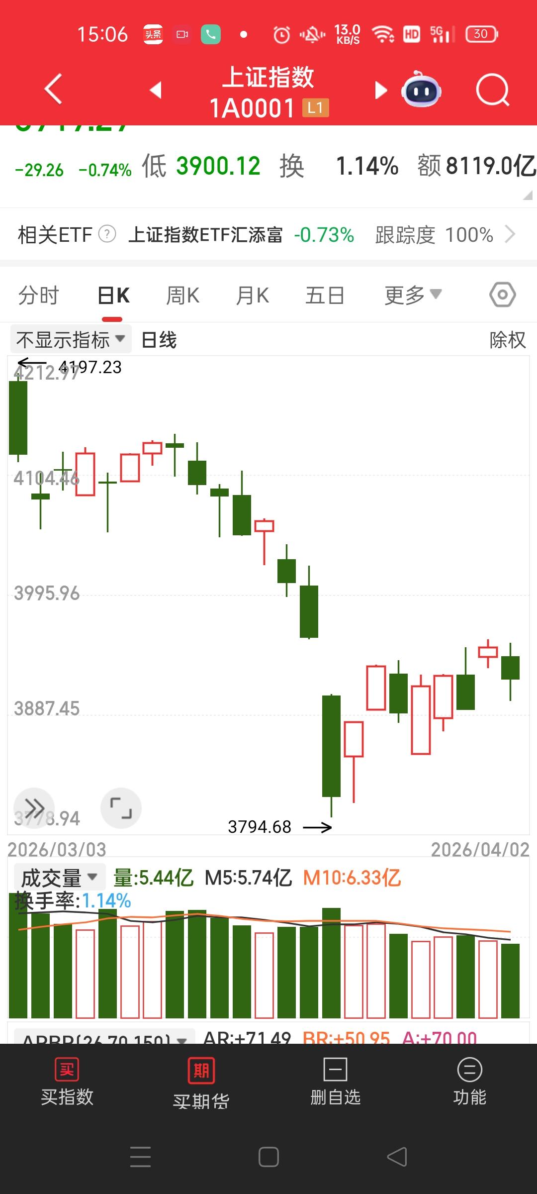 手里两只股票全跌,4月份才刚2天就亏掉2000多元,今天的心情糟透了! 今天一天也没怎么看盘,因为我知道就算今天两只全涨停,也还不到成本价呢,这两只跌的太狠了,索性干脆就不看了,眼不见心不烦! 真是进错一只没十天半个月是出不来的,不能说市场不好,只能说自己选股水平太差,慢慢熬吧! 同志们,你们手里的票是不是都大涨呀?