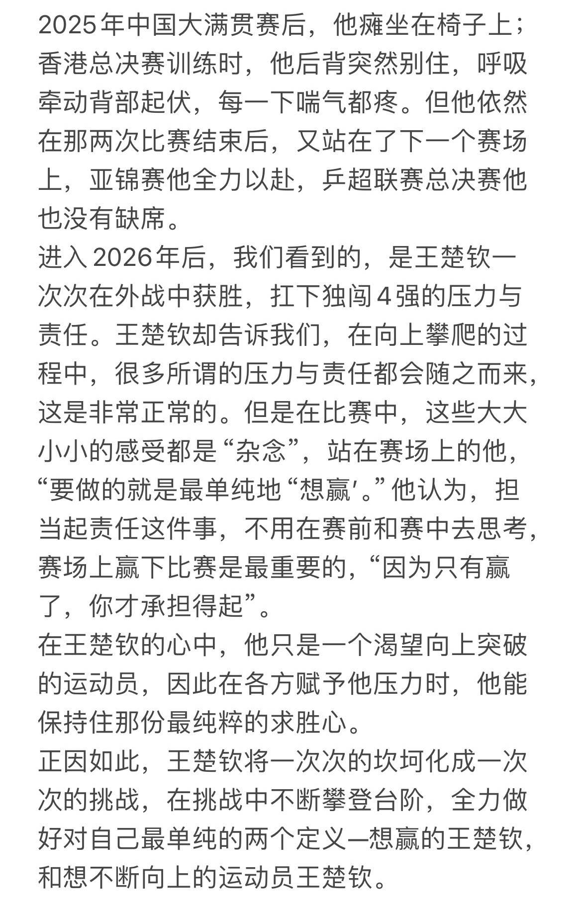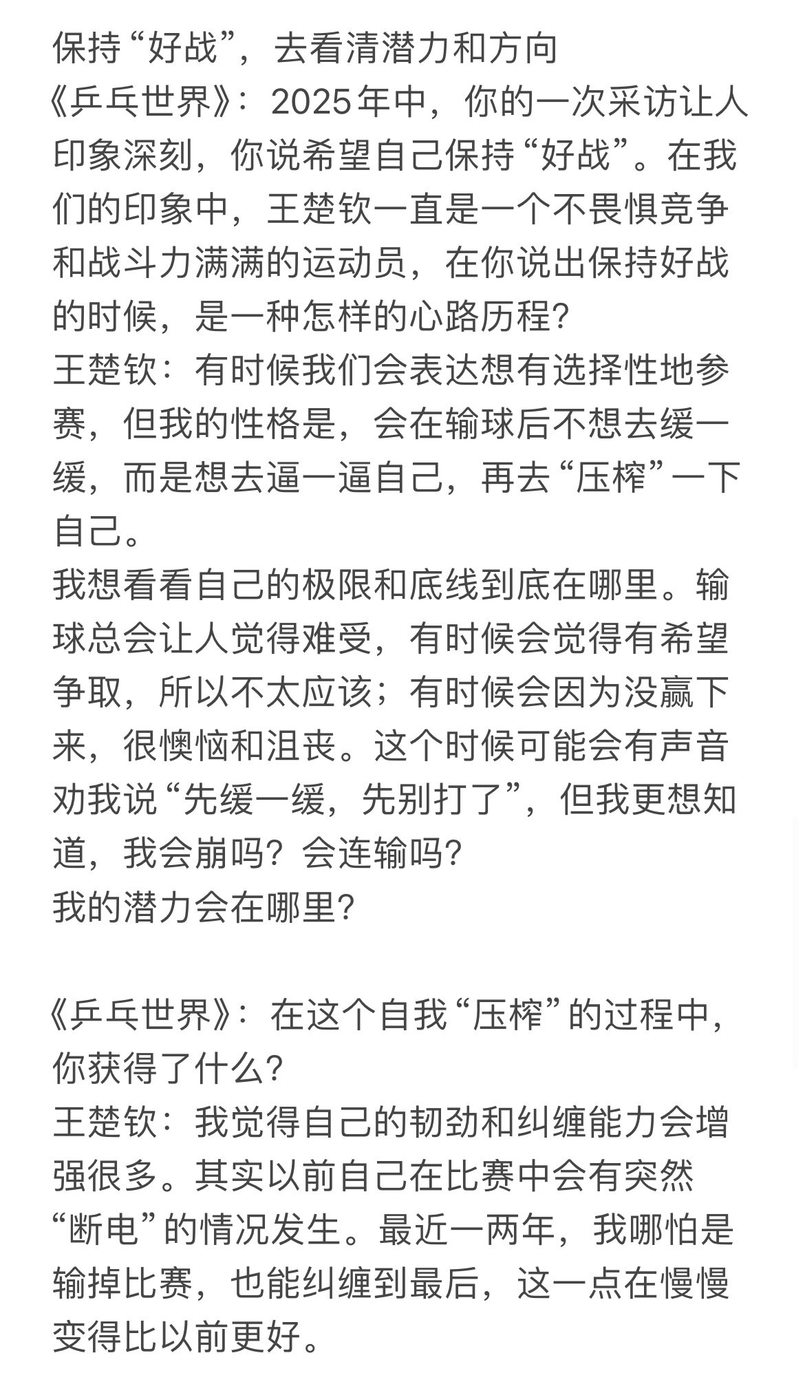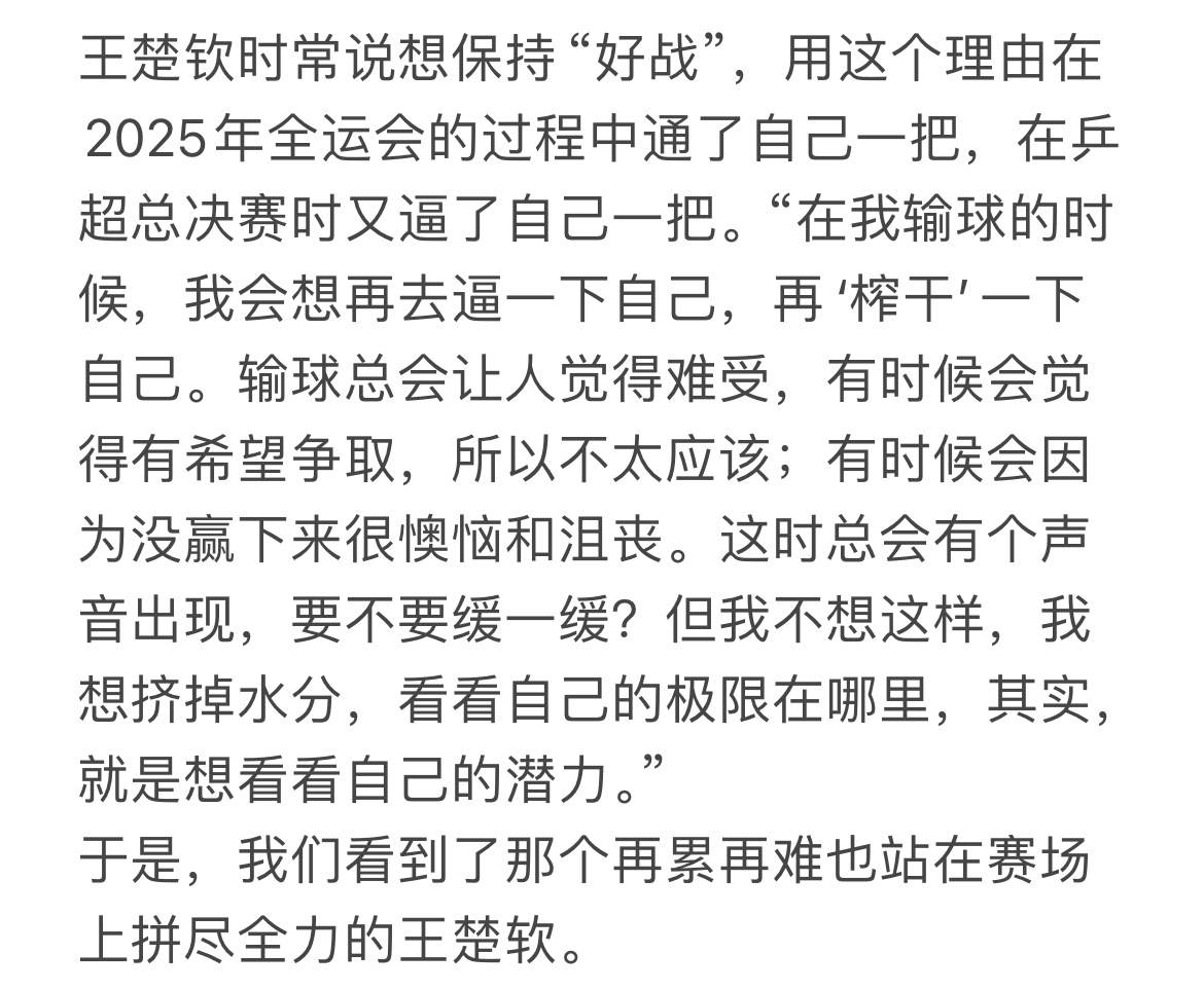 我的性格是,会在输球后不想去缓一缓,而是想去逼一逼自己,再去“压榨”一下自己。我想看看自己的极限和底线到底在哪里。…这个时候可能会有声音劝我说“先缓一缓,先别打了”,但我更想知道,我会崩吗?会连输吗?我的潜力会在哪里?