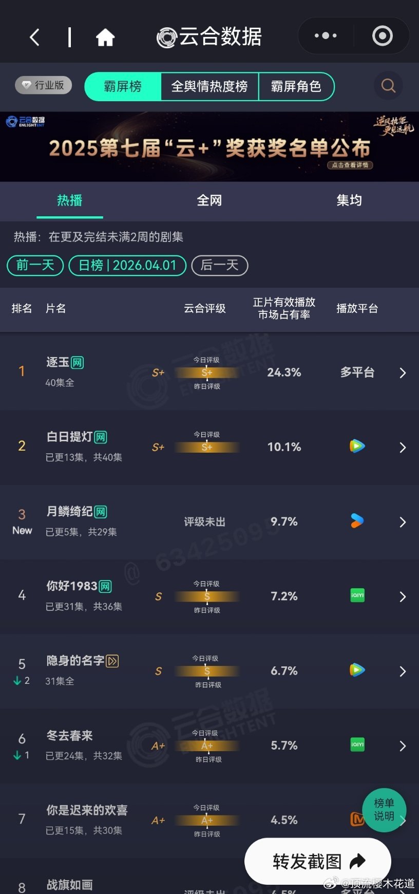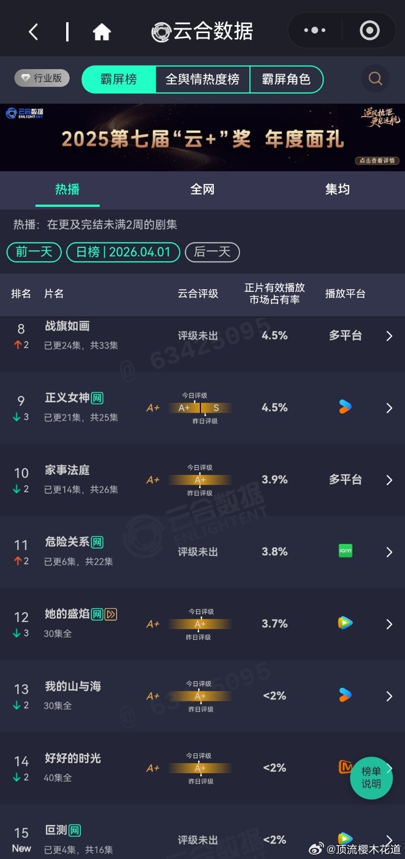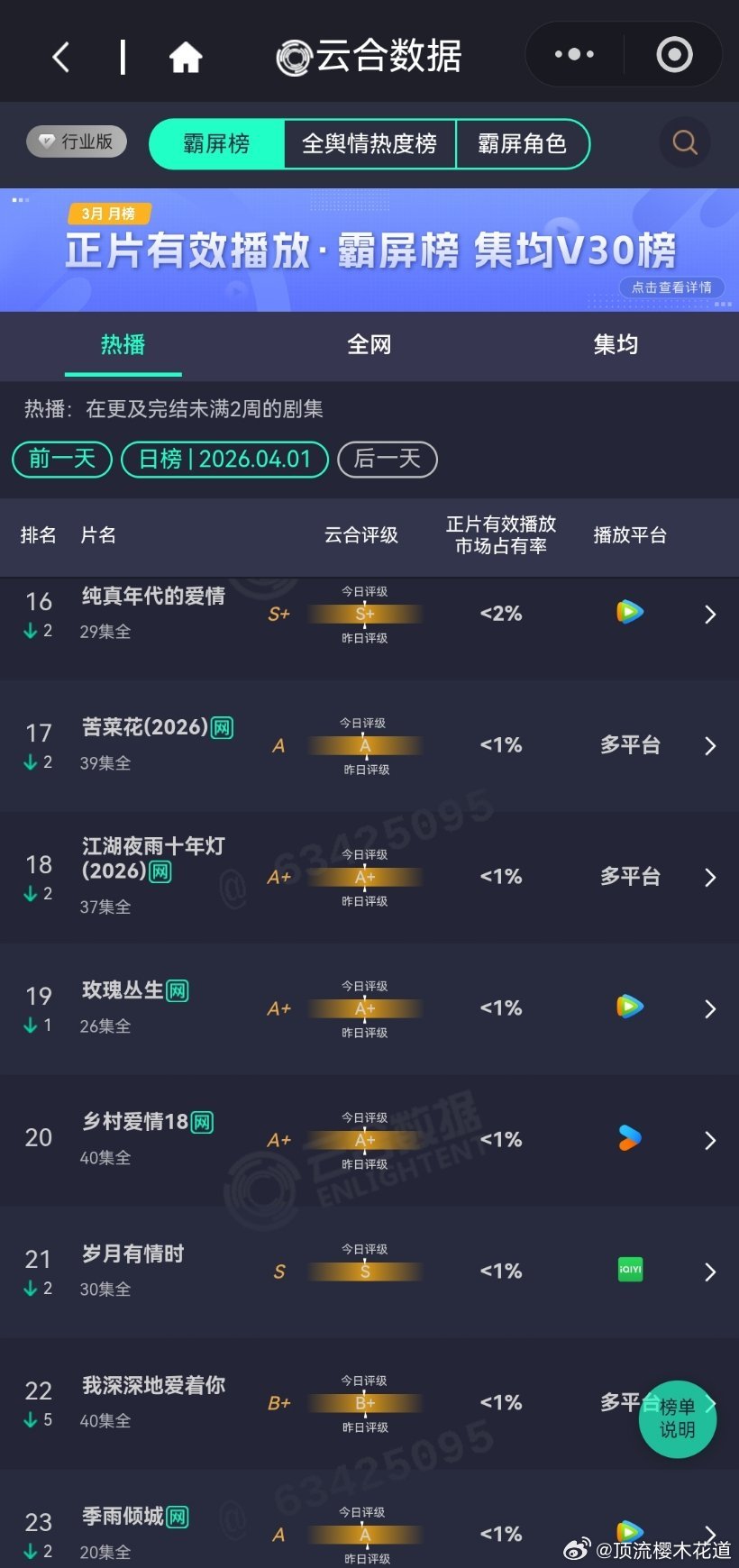 2026年4月1日云合播放占比云合 VS酷云逐玉云合24.3%,酷云27.22%白日提灯云合10.1%,酷云11.16%评级S+,感觉保不住,不过热播期长可以磨月鳞绮纪云合9.7%,酷云7%对比来说,算高开。