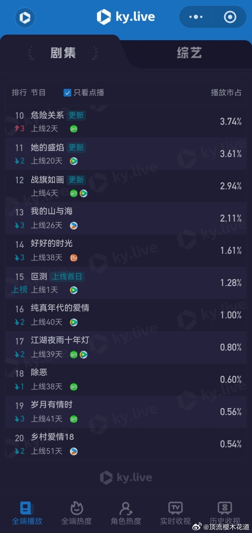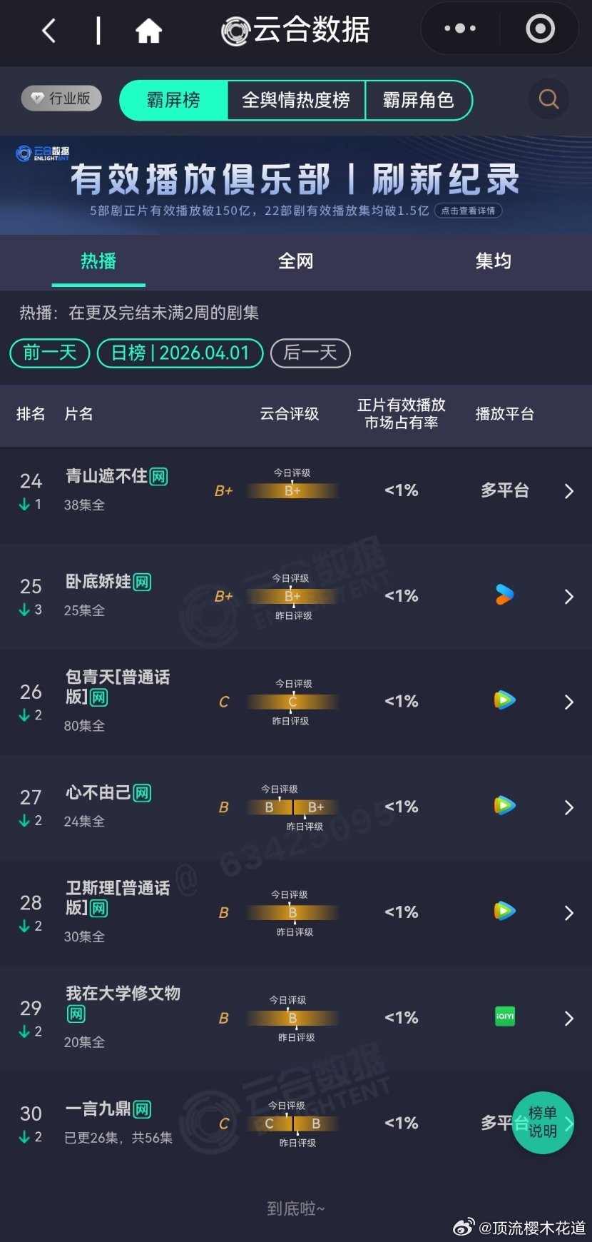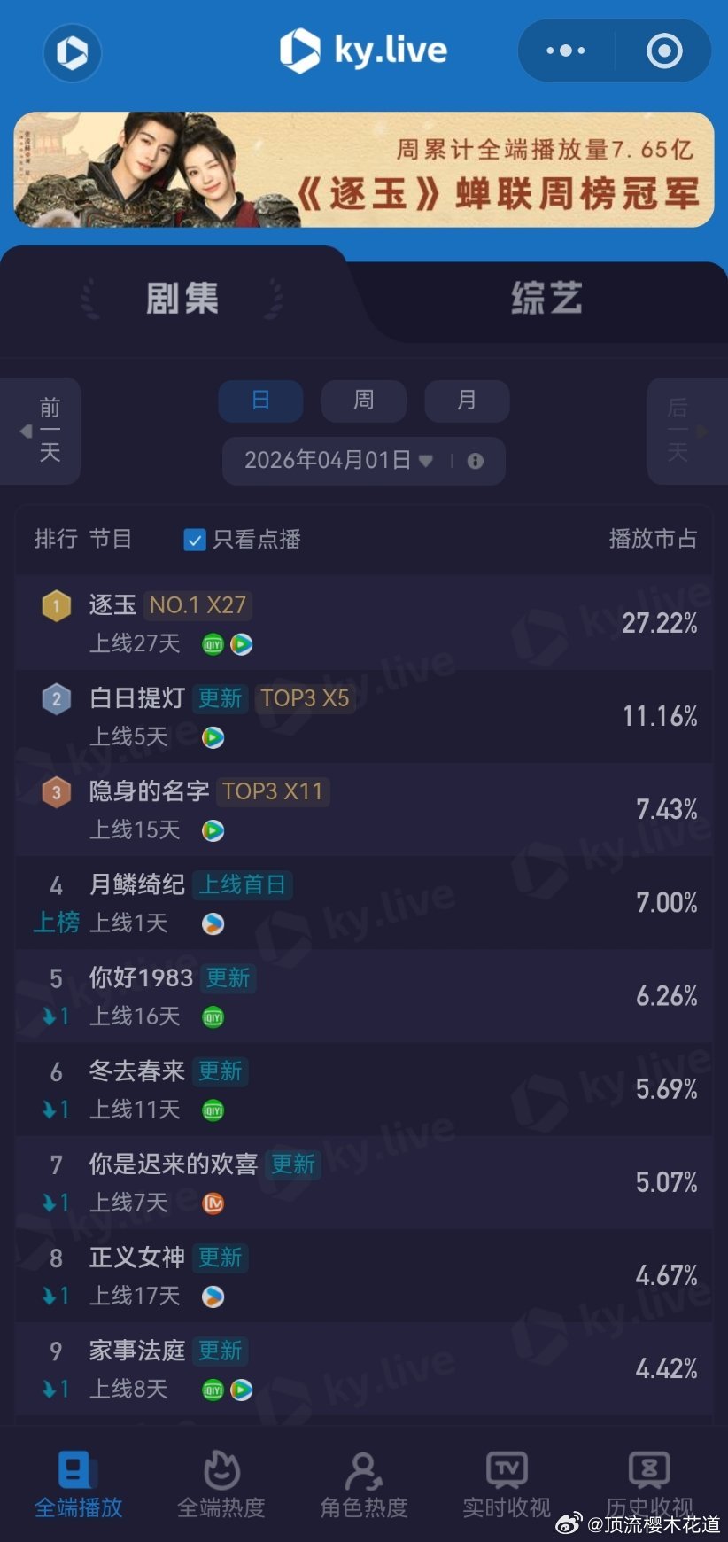 2026年4月1日云合播放占比云合 VS酷云逐玉云合24.3%,酷云27.22%白日提灯云合10.1%,酷云11.16%评级S+,感觉保不住,不过热播期长可以磨月鳞绮纪云合9.7%,酷云7%对比来说,算高开。