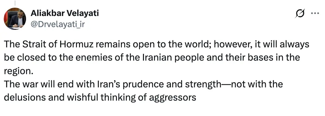 当地时间4月2日,伊朗最高领袖外事顾问、前外长韦拉亚提在其个人社交媒体平台账号上表示,霍尔木兹海峡对世界开放,但对伊朗人民的敌人及其在该地区的据点将永远关闭。