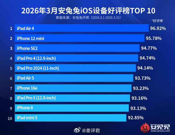 #差评说数码# 刷到安兔兔这个 iOS 设备好评榜,iPhone 里好评率最高的竟然都是相对低价的机型 ,甚至排前面的是已经被砍掉的 mini 系列。。。完美诠释了什么是叫好不叫座,要是真听网友的做手机指不定亏成啥了