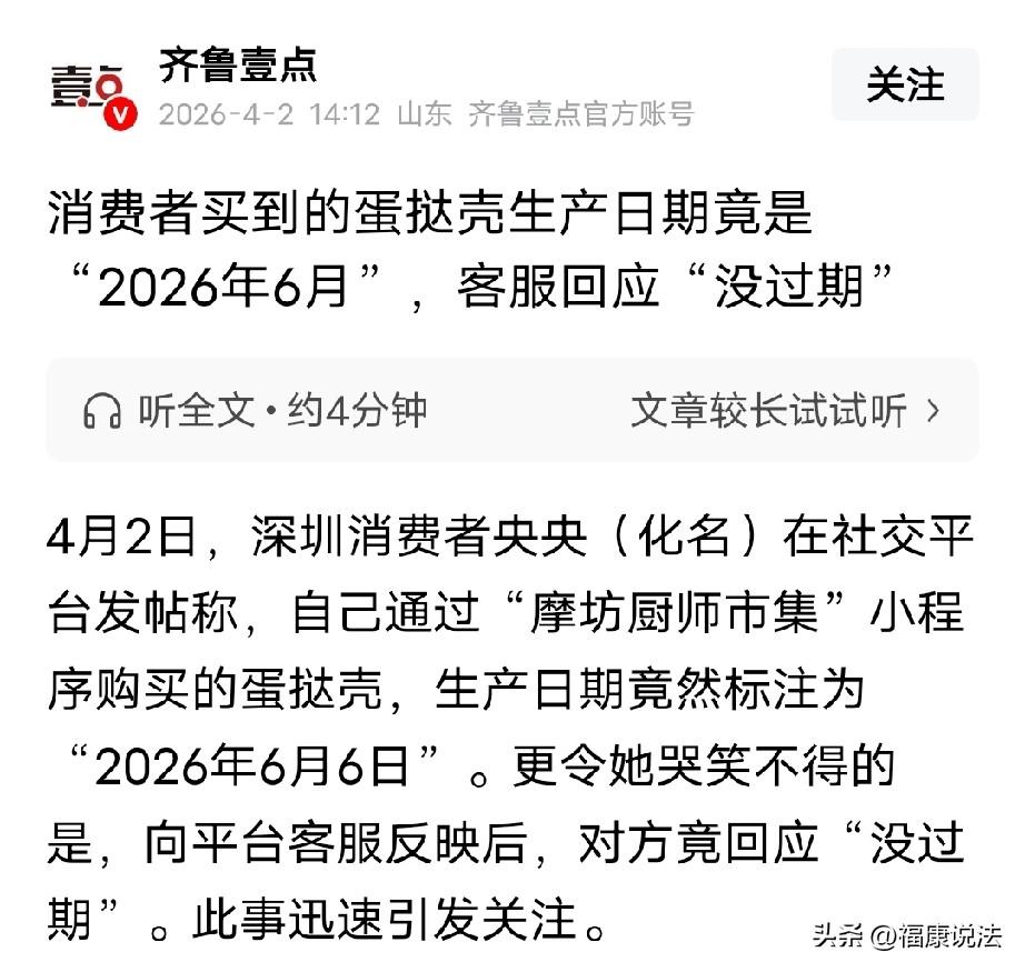 “离大谱!”深圳,女子在4月1号下单买了蛋挞壳,次日,她收到货打开一看生产日期是:2026年6月6日。女子懵了,离6月还有2个月呢,她赶紧找商家要说法,结果,商家客服回复:没过期。直接给女子气的火冒三丈,质问对方:像话吗?当然没过期,都还没到生产日期呢!而后商家的处理方式,令女子很无奈。 正常买吃的东西都会看一眼生产日期,图个新鲜放心,可央央(化名)最近买烘焙食材,竟收到了标着“2026年6月6日”的蛋挞壳,她都惊呆了,新鲜的也太超前了? 原来,4月1日晚上,央央在某个小程序下单了两件商品,其中一款是“法点烘焙大圆形香草味挞壳”,本想着第二天就能用上,满心期待地等快递上门。 结果第二天,收到货后,她一早拆开包裹,她盯着产品标签瞬间愣住——上面清清楚楚印着生产日期:2026年06月06日。 “我当时都怀疑自己看错了,”央央后来跟记者回忆,现在都2026年4月了,这蛋挞壳居然是两个月后才“生产”的,难不成厂家会时光穿梭? 这明显是“早产”的产品,让她心里直犯嘀咕,这还能食用吗?于是,她赶紧联系平台客服,想讨个说法。 可客服的回应彻底超出了她的预料。面对蛋挞壳日期为什么是两个月后的? 客服只轻飘飘回了一句:“没过期。” 这句话把央央噎得半天说不出话,又气又无奈,她质问对方:合着是我错了?是我过期了,当然没过期,都还没到生产日期呢! 记者随后以消费者身份联系该平台,工作人员先是辩解“今年的6月6日没到期”,被追问后又改口说是厂家打错了,只让央央加微信等处理,全程没正面回应央央买的2026年6月6日日期的商品该如何赔偿。 联系制造某某烘焙(东莞)有限公司时,对方更是推诿,说不清楚对接部门,只说会安排人回复,结果直到最后也没动静。 最后,央央投诉后,商家客服回应,说日期打错了,会把这批次产品的质检报告给她看。 其实这事儿根本不是“没过期”那么简单。 消费者花钱买吃的,图的就是安全放心,结果拿到手一看,生产日期还是未来的,换谁都会觉得不对劲。 这明显是工作马虎,连日期都能打错,很难让人相信产品的生产、质检流程是规范的,心里难免犯嘀咕,这东西到底能不能吃? 更让人无语的是客服的态度,消费者去反映问题,不道歉不解决,反倒说“没过期”,完全是敷衍了事。 这种回应既不尊重人,也没意识到问题的严重性,只会让消费者更生气。 平台把责任推给供货商,厂家又一问三不知,互相推诿,没有一方主动站出来认错、解决问题。 直到瞒不住了,才说日期打错了,这种处理方式太不负责。 从法律角度怎么看这件事呢? 《食品安全法》第34条第10项规定:禁止生产经营标注虚假生产日期、保质期的食品、食品添加剂 。 生产日期标成未来时间,属于典型虚假标注。 法律不允许食品日期造假,因为消费者要靠日期判断能不能吃。 客服说“没过期”完全站不住脚,日期造假本身就违法。 “早产”产品妥妥属于虚假标注。监管部门也明确表示,这种情况最高可罚十万元,商家和厂家这么处理,实在太不负责。 另外,消费者可以向商家索赔吗? 消费者可以要求退款以及十倍赔偿(最低赔1000元)。 因为“早产”日期属于故意虚假标注,法律直接视为商家“明知有问题还在卖”。不管蛋挞壳本身坏没坏,标签造假就符合“退一赔十”。 《食品安全法》第148条第2款规定:生产、经营明知是不符合食品安全标准的食品,消费者可退一赔十;增加赔偿不足1000元的,按1000元算。 消费者不用证明吃了出问题,凭购物记录、产品照片、聊天记录就能索赔。 目前,央央等待商家给一个正式的处理方案中。 央央本来只是想正常买食材,结果碰上这么糟心又离谱的遭遇,希望商家能给出一个合理的解决方案。