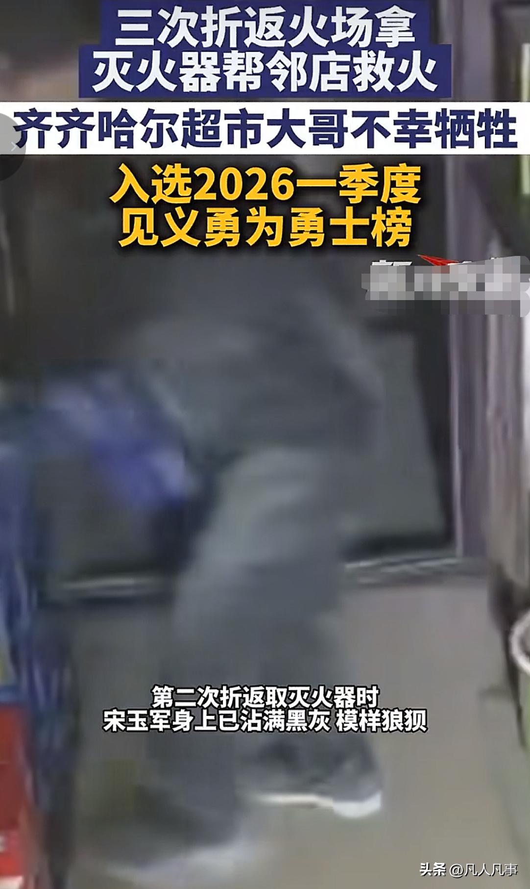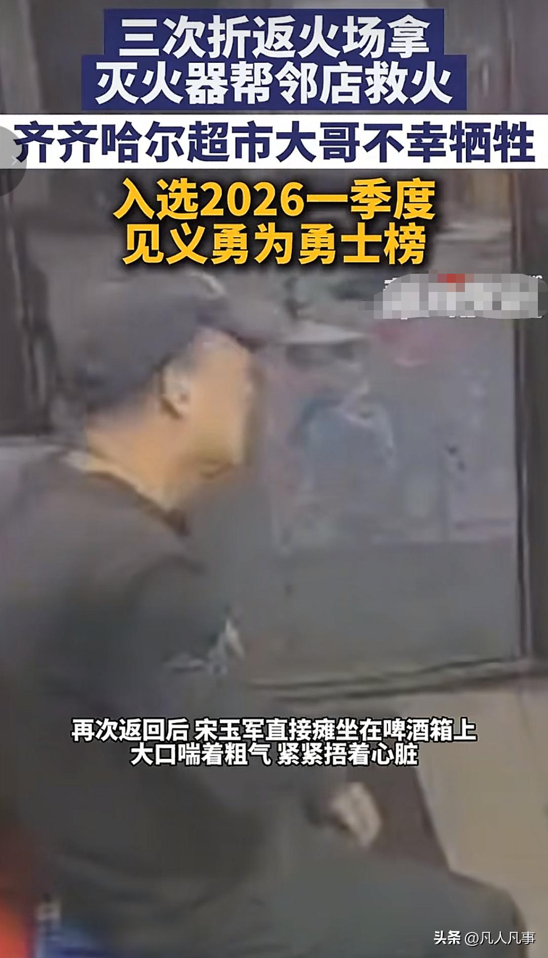 黑龙江齐齐哈尔超市大哥宋玉军,为扑灭隔壁烧烤店燃起的大火,三次冲进火场施救,最终不幸牺牲!在3月31日夜,正在超市上班的宋玉军听说隔壁烧烤店发生了火灾,迅速从超市里找出两个灭火器,冲进烧烤店灭火。从超市的监控视频看,在宋玉军返回时,身上全是黑漆漆的灰尘,显然那火势不小,两罐灭火器用完,并没有控制住火势。他来不及喘口气,迅速又提着两个灭火器冲了出去!再他第三次出现在监控画面中时,脚步已经有些踉跄,不停地在咳嗽,可是他依然再次提着灭火器奔向了火场!等他再次返回后,他浑身没了力气,坐在超市的啤酒箱上,大口大口地喘着粗气,而他的右手,却死死地按在胸口上,表情有些痛苦,显然很不舒服。就是在这样的情况下,他看见别人还在忙着救火,深深地吸了两口气想站起来继续帮忙。但是刚站起来没走两步,就站不住脚、摇摇晃晃地倒下了。旁边的阿姨见状忙上前扶住他,让他休息一会儿。但是宋玉军却软软地倒了下去!扶着他的阿姨从最初的安慰一下子变成了惊惶,口中大喊着“宋玉军,宋玉军!”想让他醒过来,可是,就这样,宋玉军再也没有醒过来,牺牲在了再次冲向火场的路上!他是家里的顶梁柱,还有一个孩子在上大学。他的事迹很快被上报,也很快入选2026第一季度见义勇为勇士榜。在这里,要为来自东北的汉子宋玉军叫一声:“好汉子!”也为他送一程:一路走好!