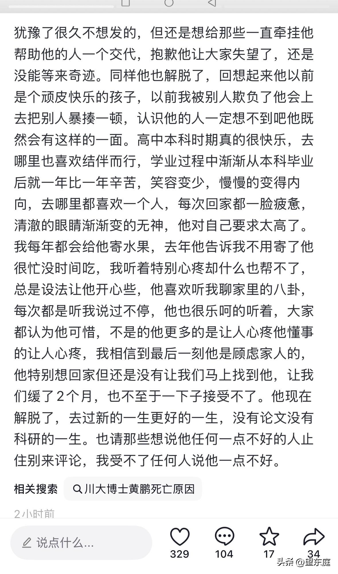 刷到遇难博士黄鹏姐姐的最新发声,她回忆了过去的种种,其中的一处小细节,看似是很小的一件事,但却无比令人心疼! 以往姐姐每年都会给他寄水果,可从去年开始,他告诉姐姐不要再寄了,因为自己没时间吃。 表面上看来,他是公派出国留学的博士,的确是风光无限。可背地里,他应该是独自承受着很大的压力,已经难以排解了,才会说自己忙到连水果都没有时间吃吧? 一个普通农村家庭出身的孩子,靠着自己的辛勤与奋进一路考到了博士,他其实已经很优秀了。 可寒门贵子向来不容易,随着读的书越来越多,背负的责任与压力也就越重。因为除了父母家人的希冀,还有周边的乡亲们也在深切的关心着他的未来! 黄鹏的离去,或许是意外,也或许是他在重压之下所作出的选择。可不管答案是怎样,留给大家的都是深深的惋惜! 其实,人活一生真的很不容易。所以,不要太过在意别人的看法,更不要对自己要求太高。平庸也好,平凡也罢,都要试着去慢慢接受最真实的自己。 无论处于什么样的状况,请记得还有爱我们的家人所在!