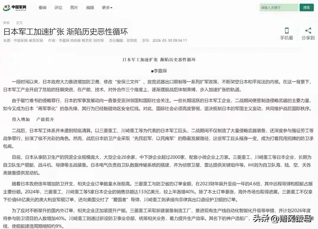 解放军报重磅发声,直接戳破日本的伪装!别被日本的无核假象骗了,44.4吨钚储备,够造5500枚核弹,完整核技术链条在手,3-6个月就能拥核,这哪是和平利用核能,分明是暗藏核武野心! 更可怕的是,日本军工一路狂飙,军费连涨11年,不断突破和平宪法束缚,历史上的侵略前科历历在目,如今军事扩张、核武暗囤双管齐下,危险信号拉满! 国虽强,忘战必危,必须时刻警惕,绝不能让历史悲剧重演!