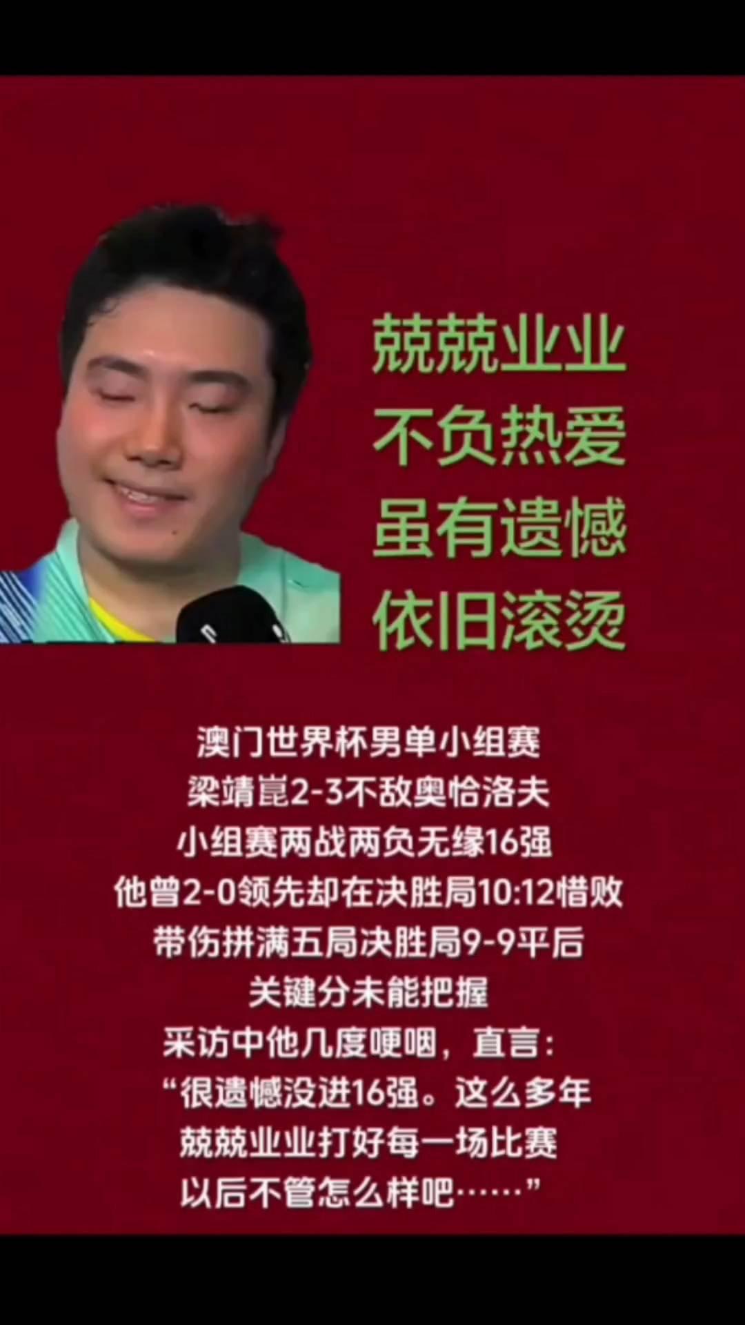 兢兢业业,不负热爱,虽有遗憾,依旧滚烫。 梁靖昆2-3不敌奥恰洛夫,小组赛两战两负无缘16强。他曾2-0领先却在决胜局10:12惜败,带伤拼满五局决胜局9-9平后关键分未能把握。采访中他几度哽咽,直言:"很遗憾没进16强。这么多年兢兢业业打好每一场比赛,以后不管怎么样吧··"