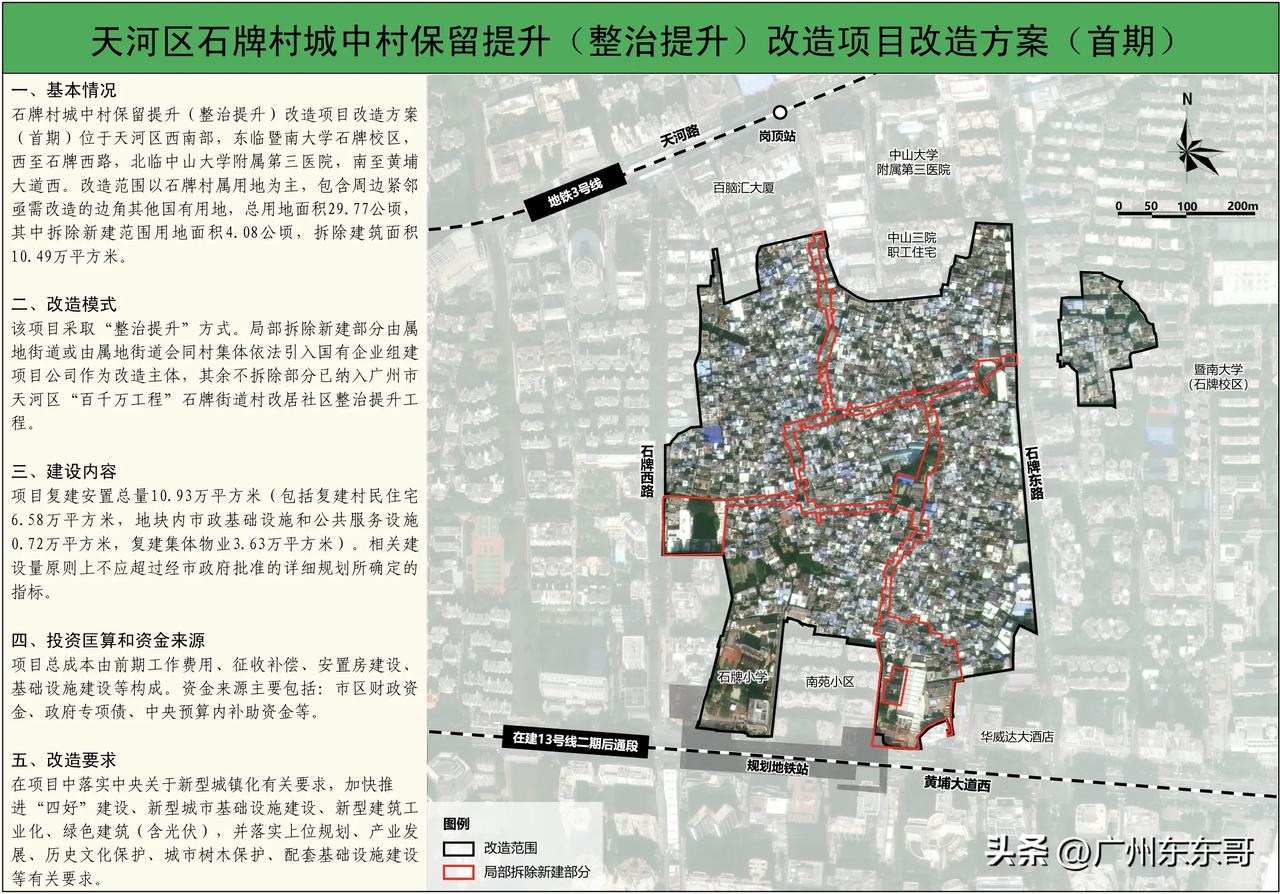 挑战天河最难旧改,石牌村改造圈定拆除范围! 随着拆迁范围和详细计划的公布,石牌村改造也是尘埃落定,终于要拆了。 鉴于1.6万的补偿方案,想在天河核心区石牌村大拆特拆,肯定不会太容易。 所以真正要拆的地方,只占整个石牌村的七分之一左右,而且主要用于建设道路,疏导交通,打通石牌村东南西北的出口。核心是破解村内消防隐患,改善村内居住环境,为后续改造打好基础。 其余未纳入拆除新建计划的地方,同时也会迎来升级改造,主要是针对社区整治提升工程,比如外立面、乱拉电线等,短时间应该都不会拆的了。