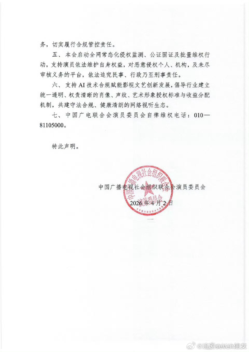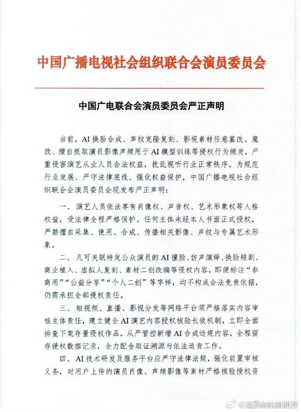 整治Ai了,明文禁止一切AI侵权行为…广电联合会演员委员会就当前AI换脸合成、声纹克隆复刻、影视素材任意篡改、魔改、素材二创、擅自抓取演员影像声频用于AI模型训练等侵权行为发声明… 非常支持的一集!中国广电联合会演员委员会就AI侵权发声明