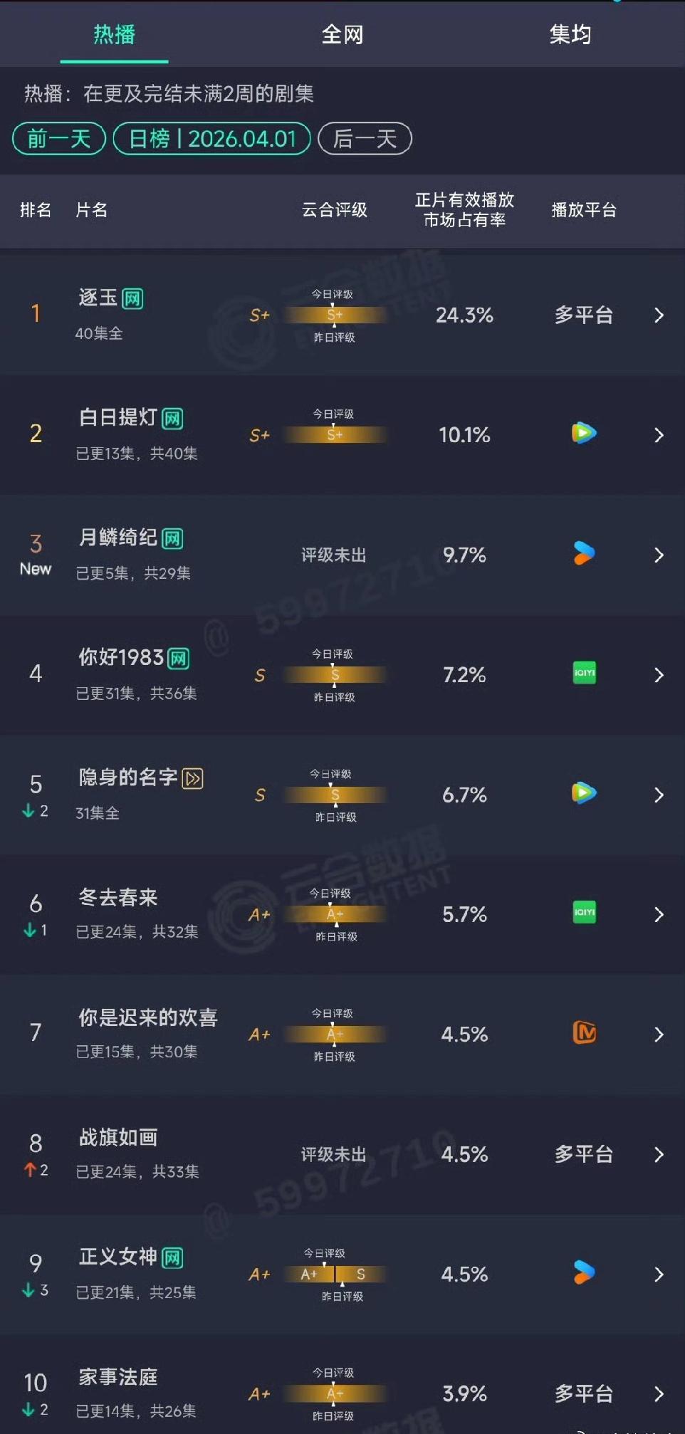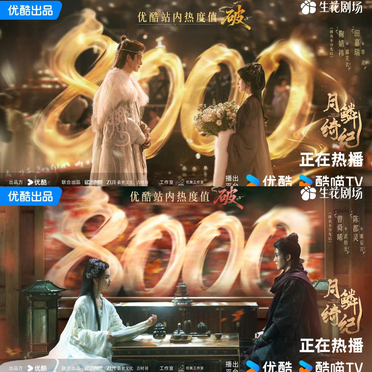 《月鳞绮纪》首播成绩不错哦!看样子很有爆的可能呢! 昨日云合数据出来了,《月鳞绮纪》首播云合占比9.7%,播放量大约在2050万左右,优酷站内热度也成功突破8000,比隔壁热巴的《白日提灯》播的要好点。如果后期剧情跟的上,有可能成为下一个《逐玉》…… 大家觉得呢?
