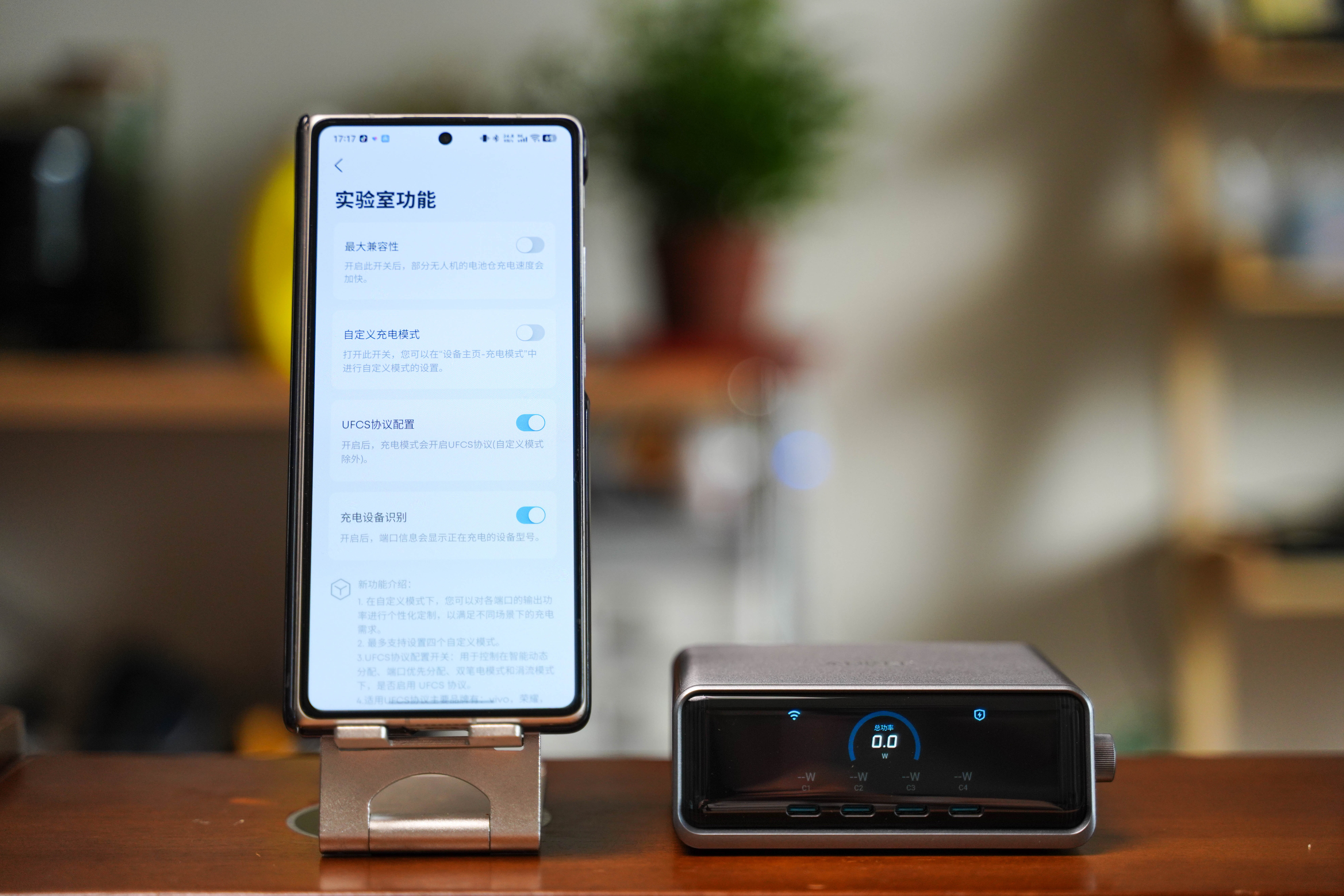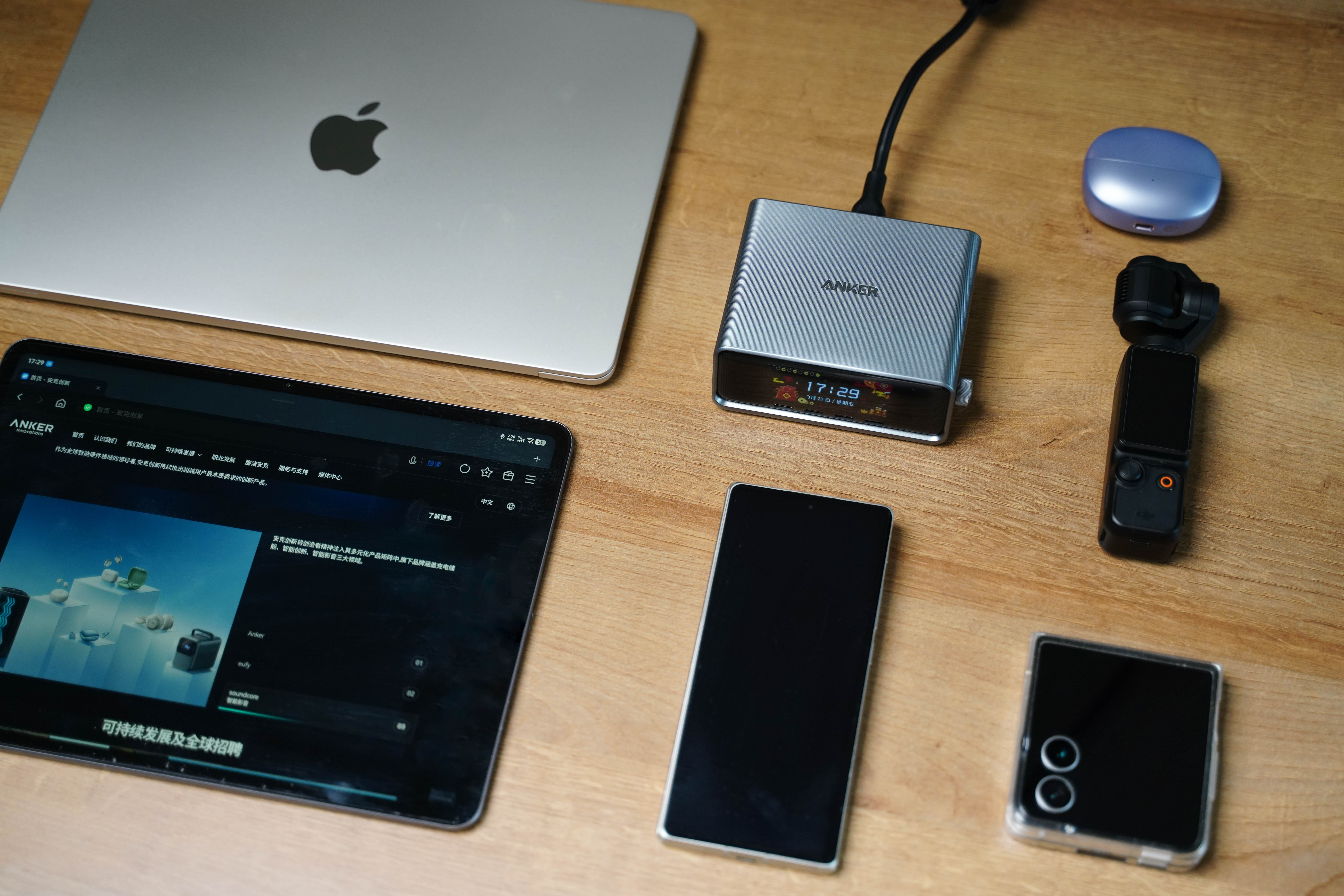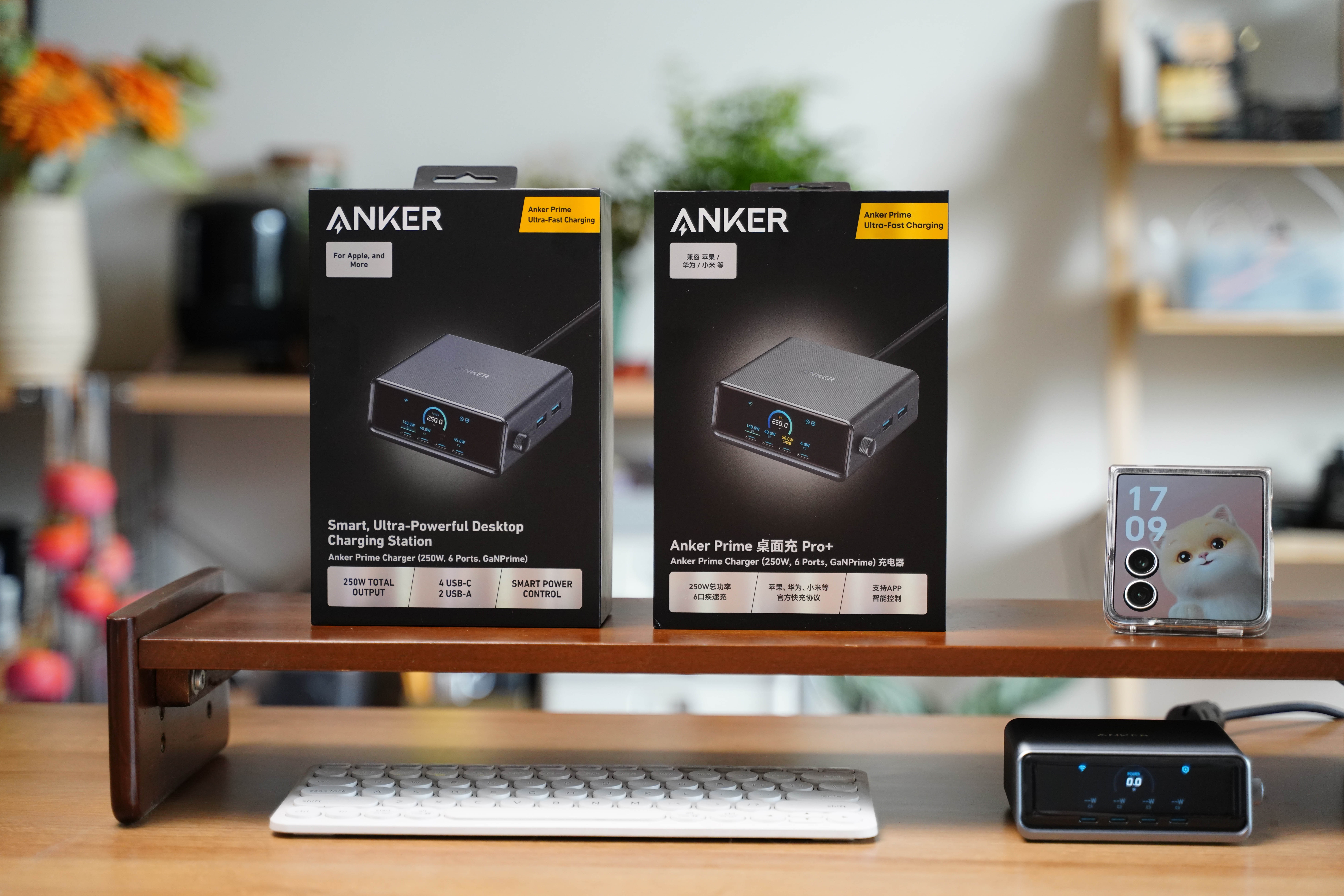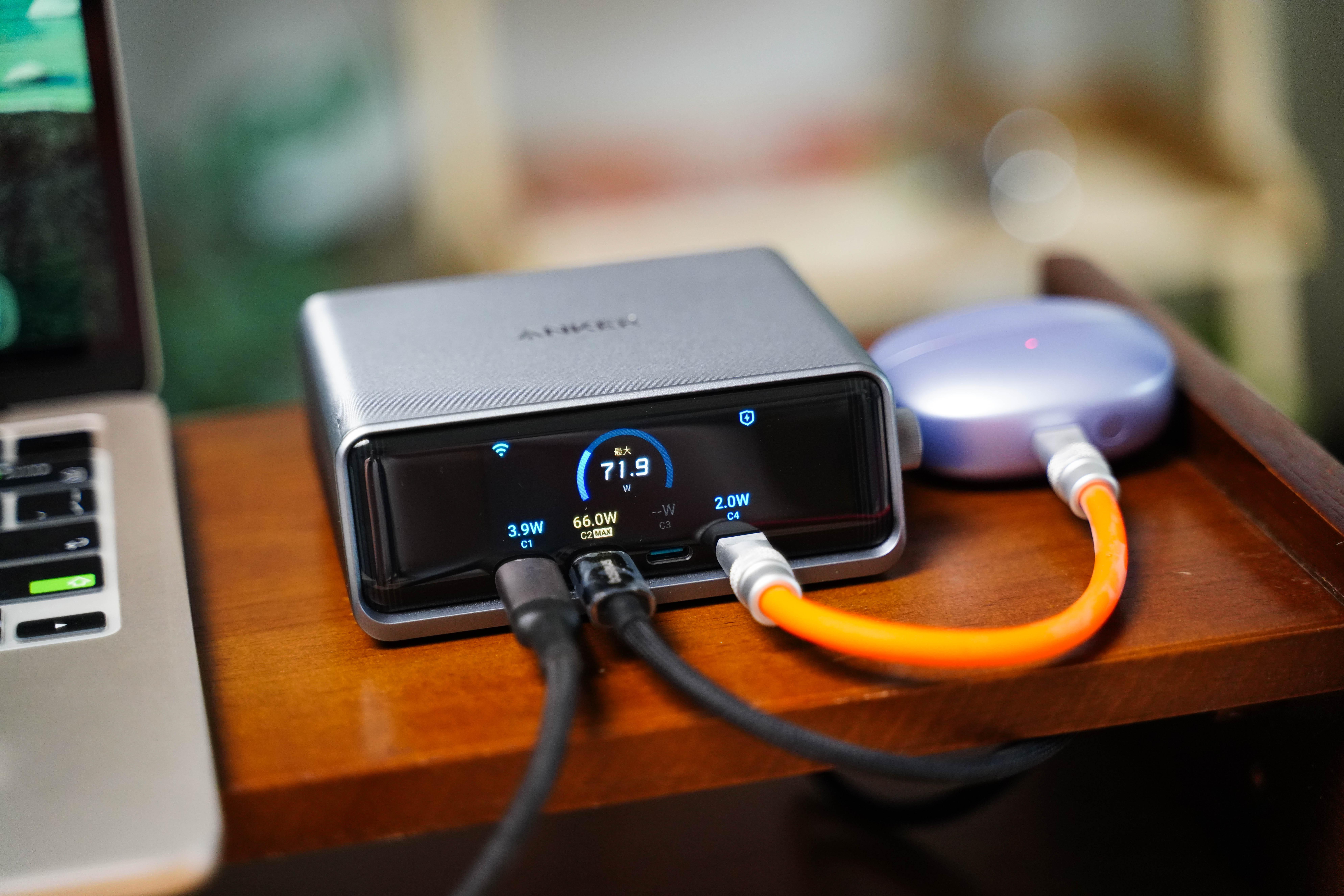 一共4C+2A 六接口总功率 250W。苹果MacBook、平板、手机、耳机、手表在桌面上摆放同时充电也不显拥挤,关键多口同充时支持AI 智能分配功率。而且Pro+还系统升级了中文菜单,正面 LCD 彩屏可实时显示每口功率,长时间高负载也只是温热,静音无风扇很适合办公桌。 如果你在手机装上Anker APP,还支持远程监控、功率自定义、OTA 升级固件以及实验室模式等功能。反正我觉得对多品牌设备用户来说,这就是目前最全面、最智能的桌面快充解决方案,很值得推荐!