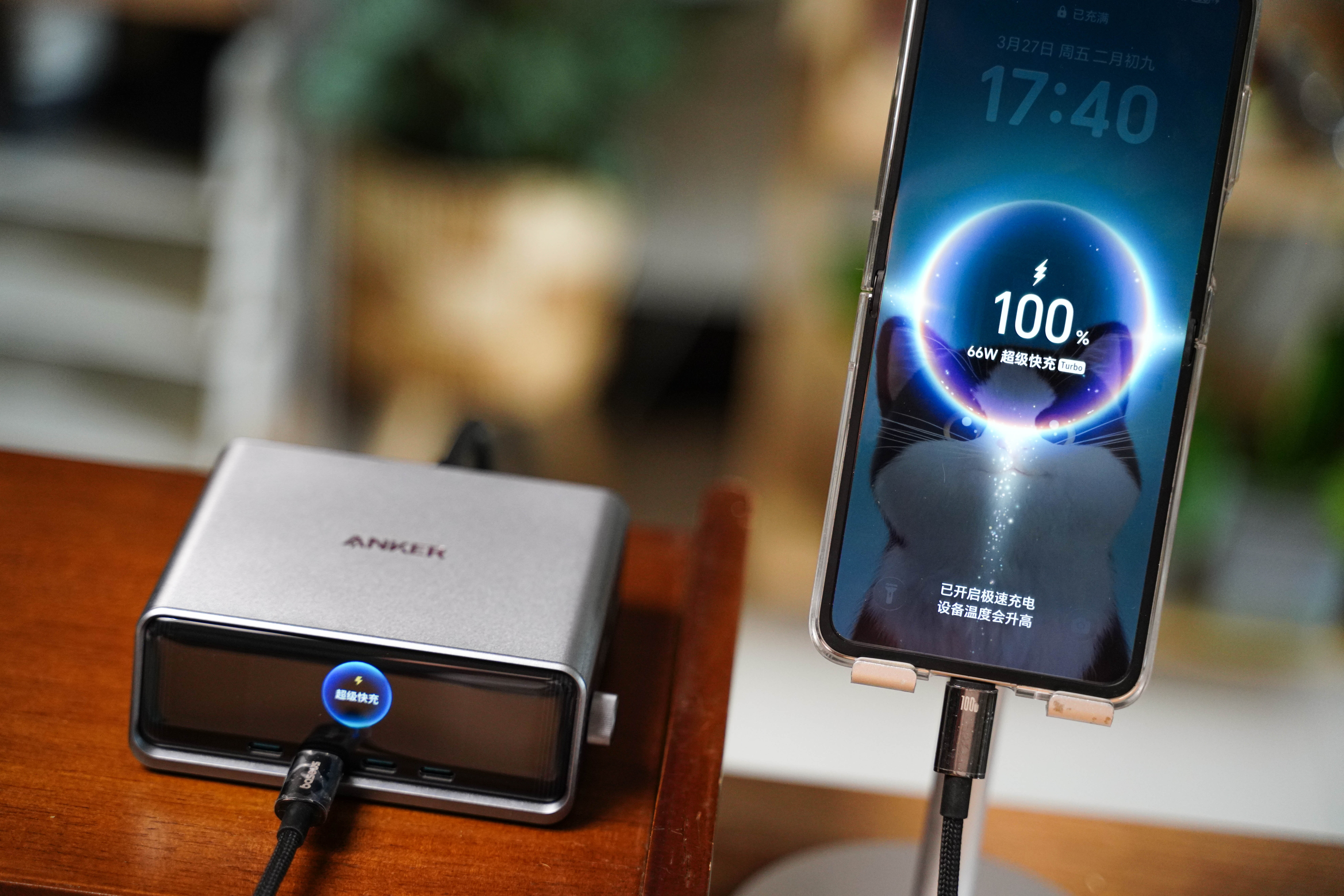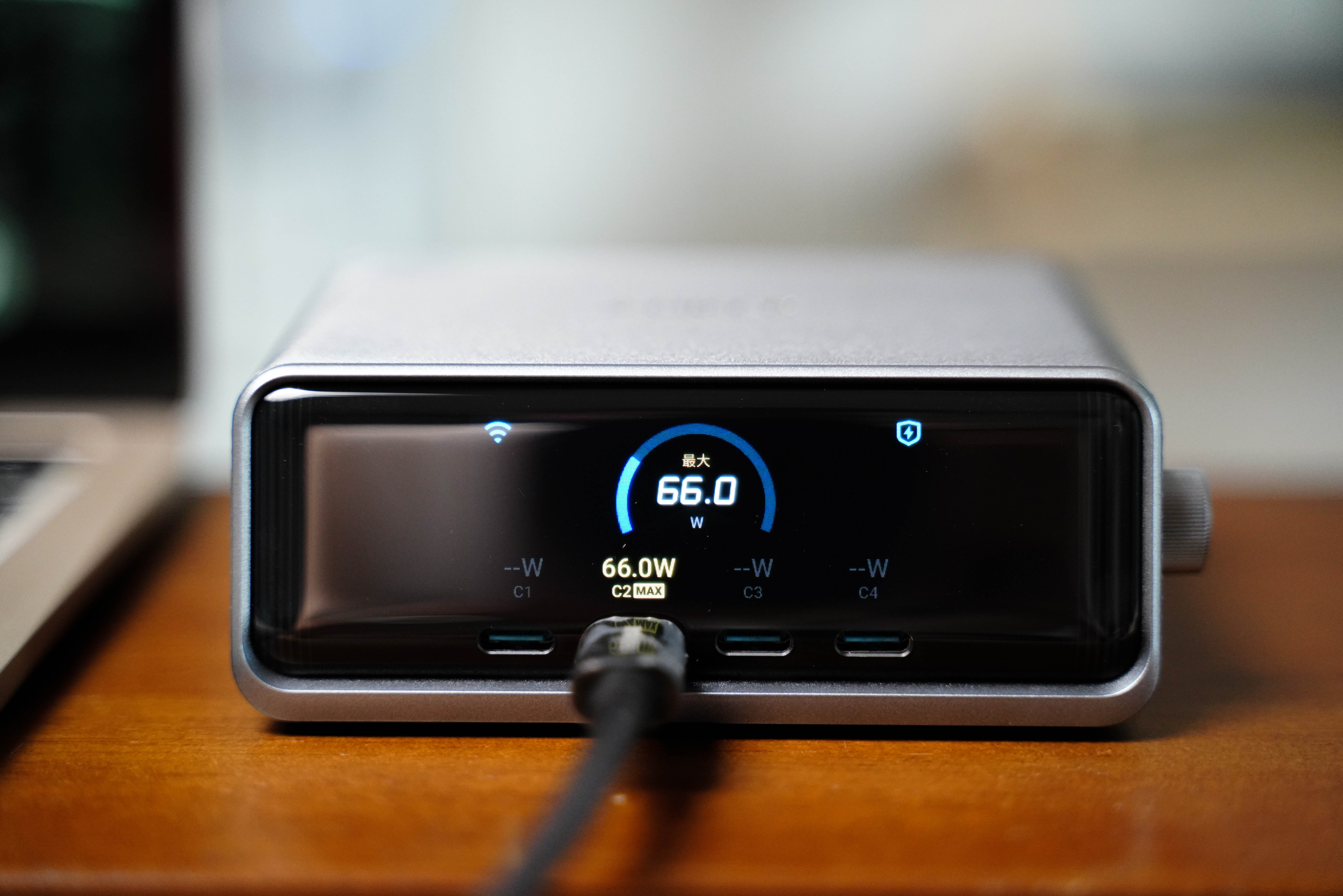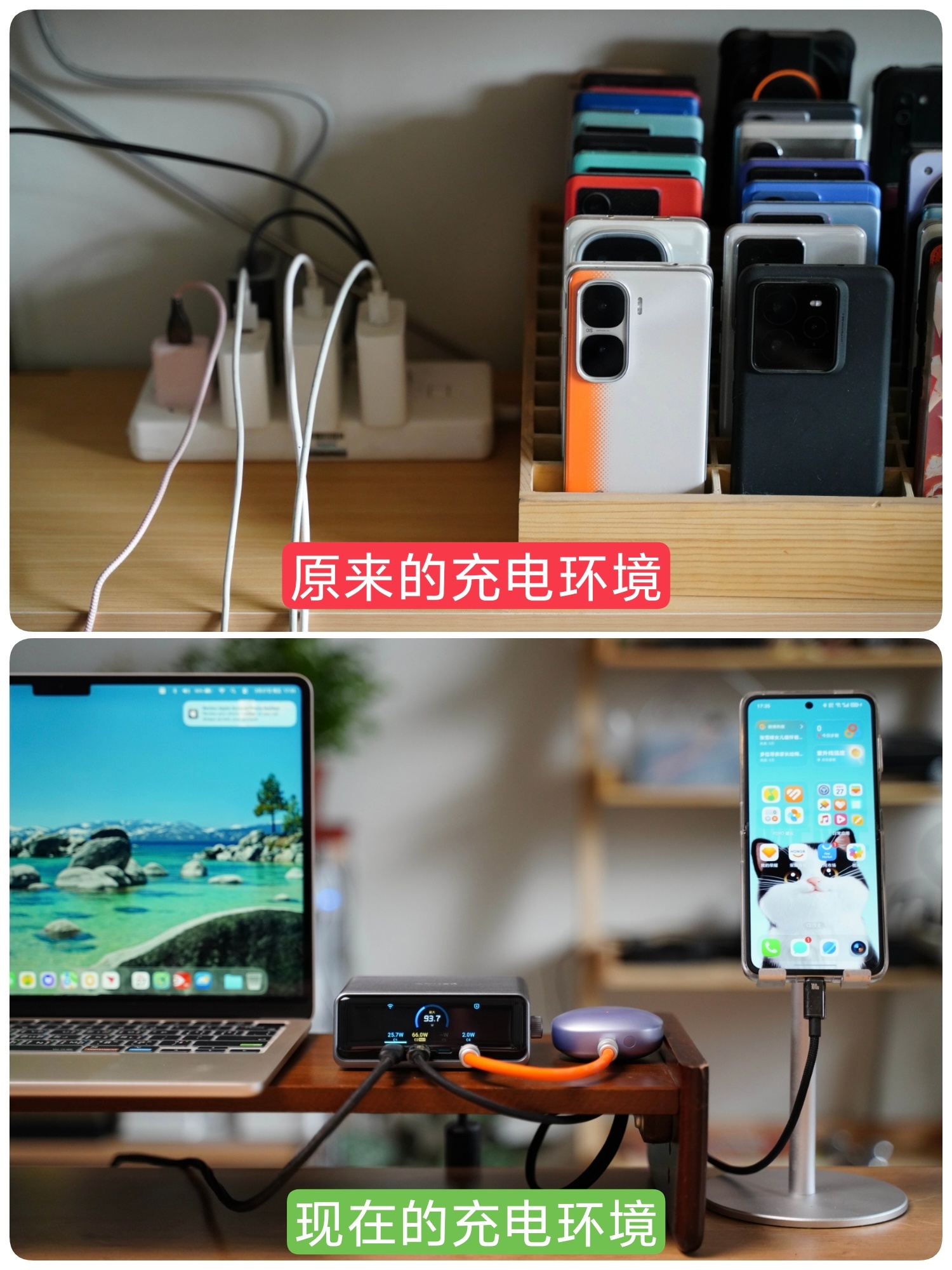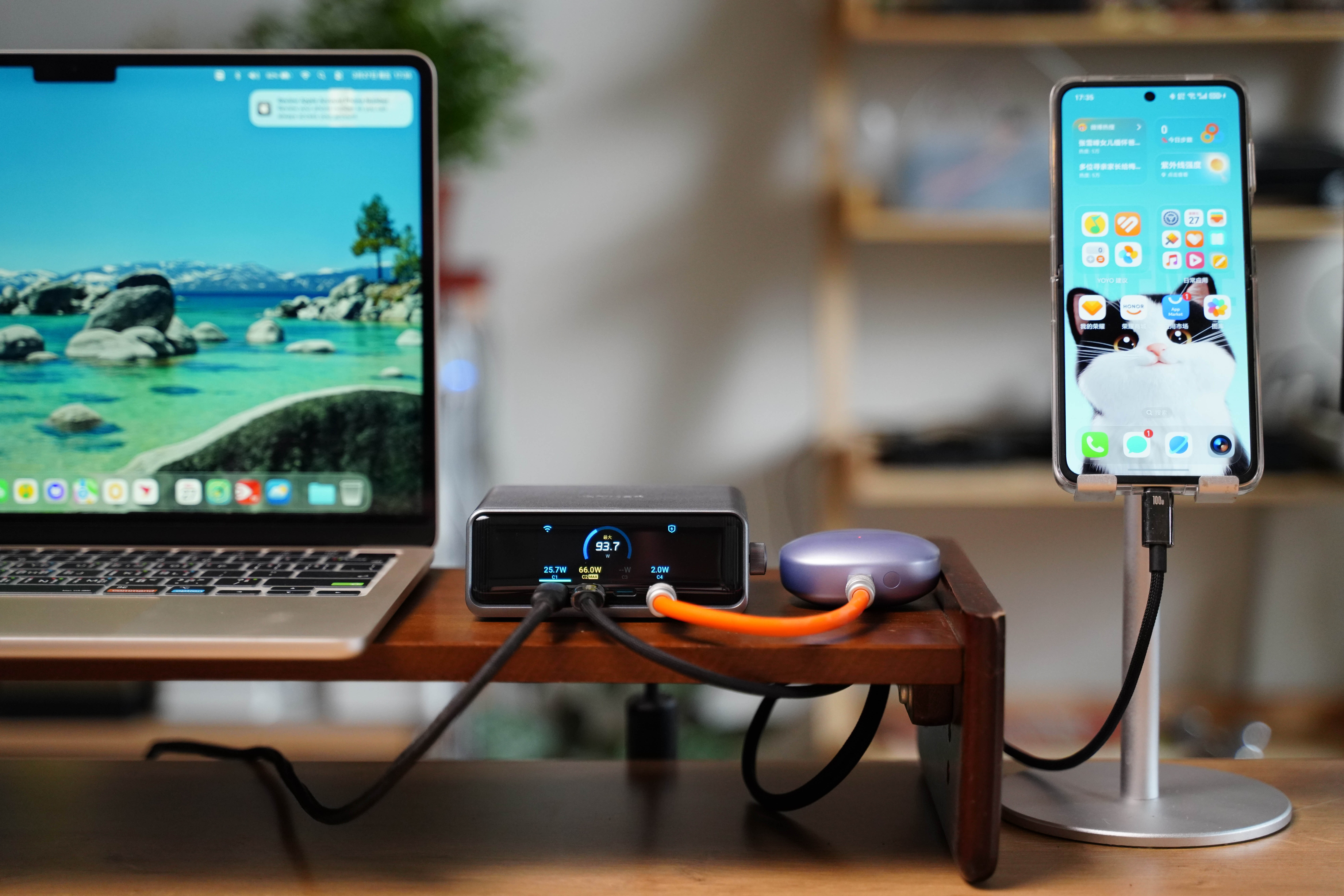 一共4C+2A 六接口总功率 250W。苹果MacBook、平板、手机、耳机、手表在桌面上摆放同时充电也不显拥挤,关键多口同充时支持AI 智能分配功率。而且Pro+还系统升级了中文菜单,正面 LCD 彩屏可实时显示每口功率,长时间高负载也只是温热,静音无风扇很适合办公桌。 如果你在手机装上Anker APP,还支持远程监控、功率自定义、OTA 升级固件以及实验室模式等功能。反正我觉得对多品牌设备用户来说,这就是目前最全面、最智能的桌面快充解决方案,很值得推荐!