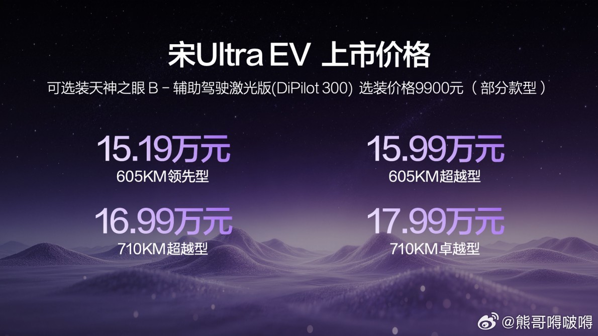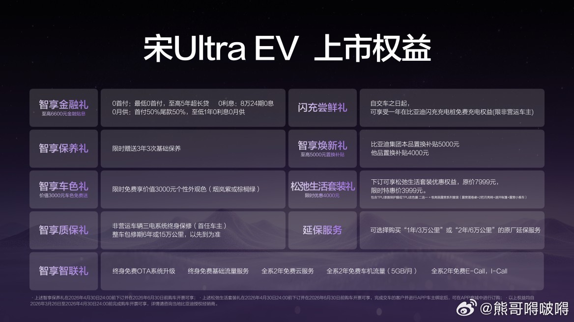 15.19万起! 比亚迪宋Ultra EV开启B级SUV闪充时代3月26日,比亚迪宋Ultra EV正式上市,官方指导价15.19万-17.99万元,共推出4款车型,同步带来“0元购、0元用、0元养”超重磅购车权益。颠覆技术打造越级体验,新车全系搭载第二代刀片电池及闪充技术,常温下5分钟快速“回血”,9分钟即可从10%充到97%,零下30℃仅多充3分钟,充电如加油。比亚迪1500kW闪充桩支持无感支付,液冷技术保障满功率输出。电池历经“500次闪充循环后边闪充边针刺”实验,容量低于77.5%免费包换,电芯终身保修。