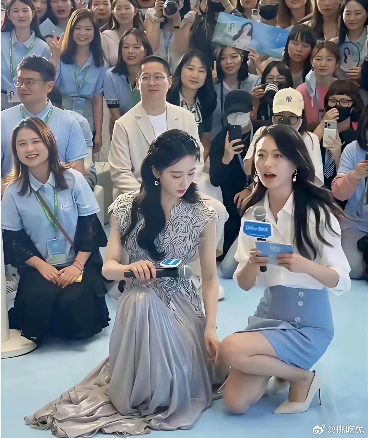 女孩子保护女孩子~刘诗诗用自己的裙子盖住女主持人的腿,很细心