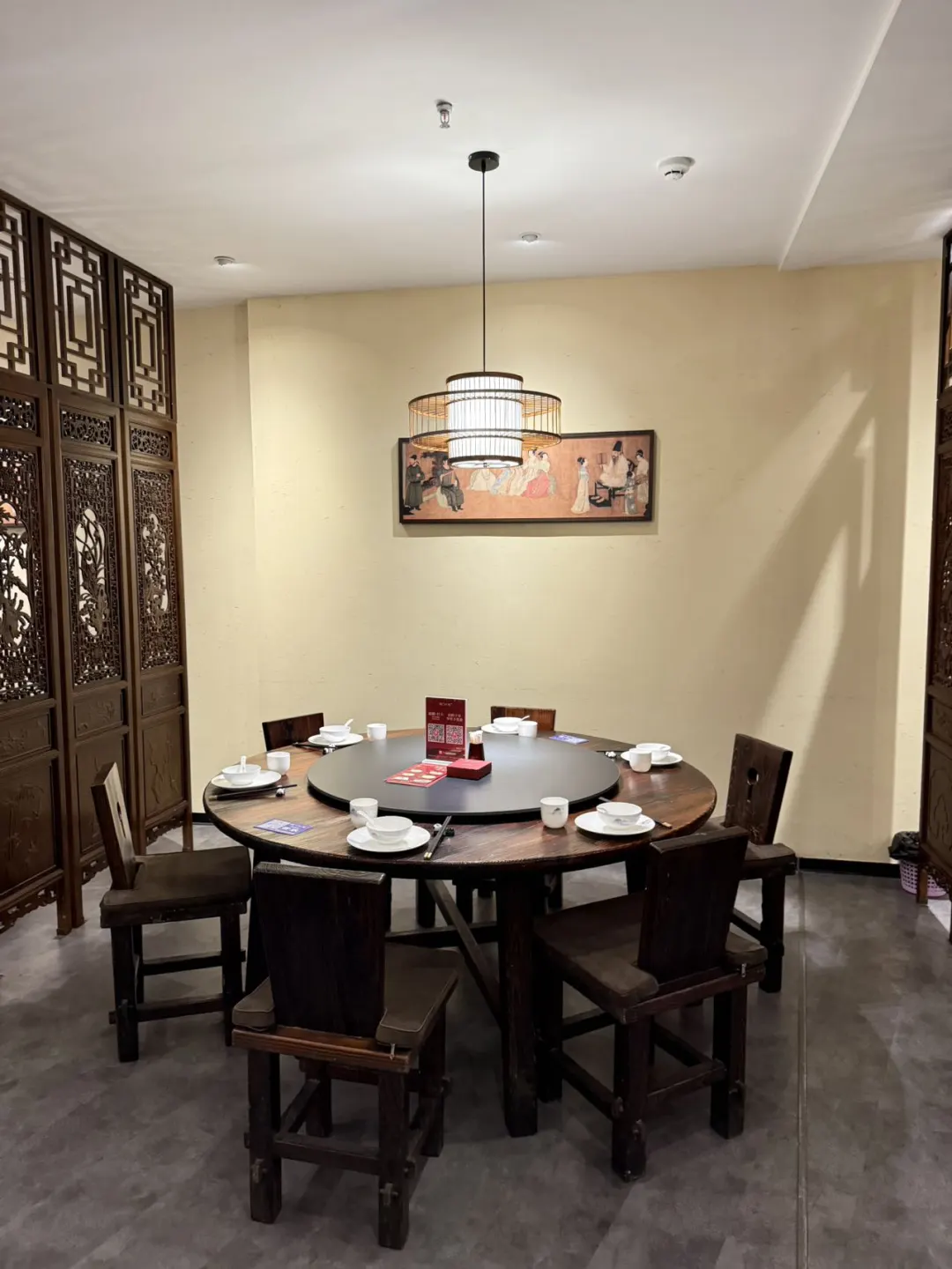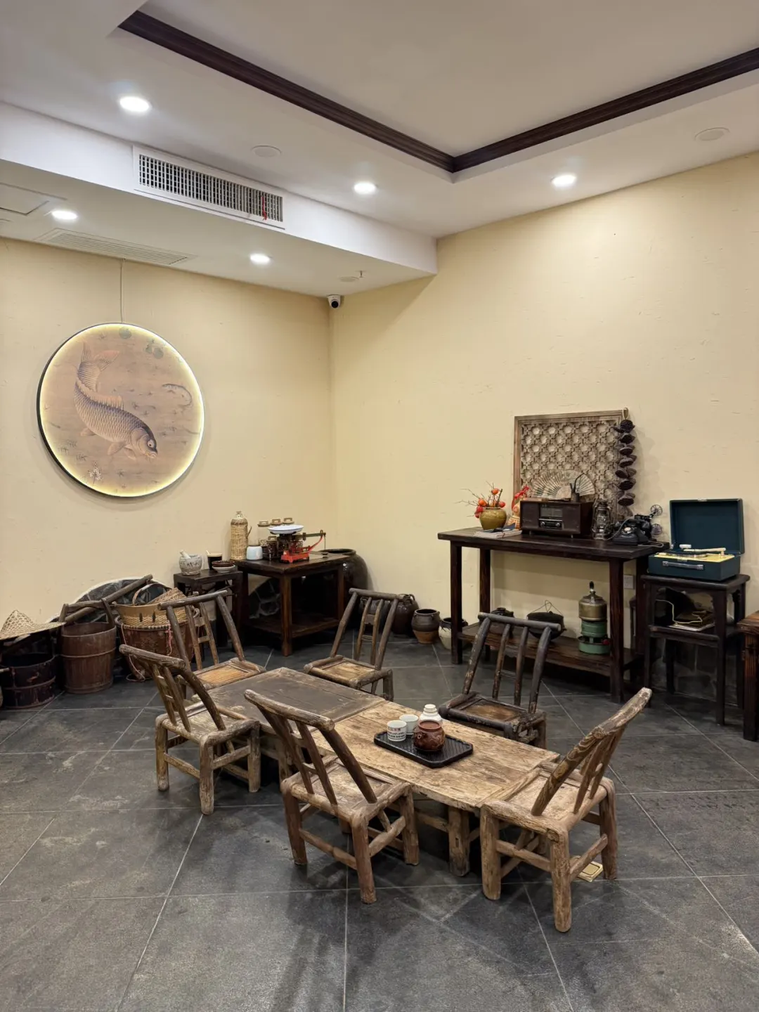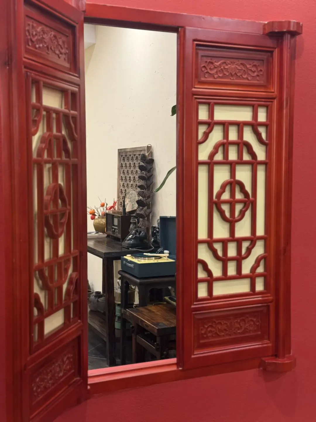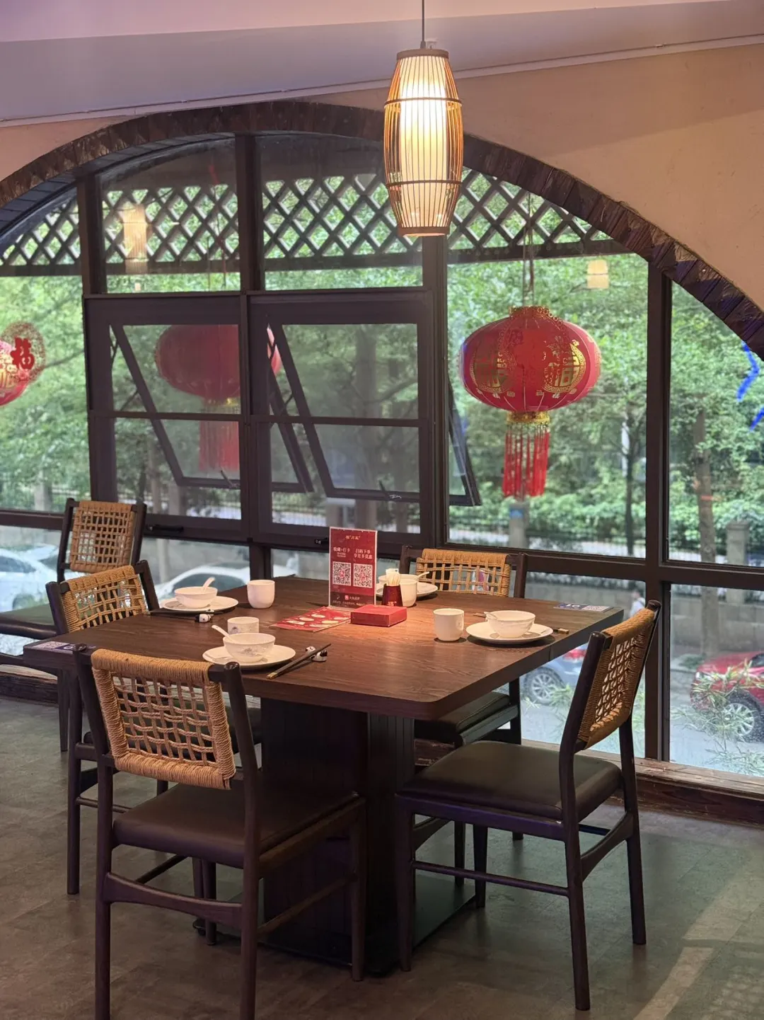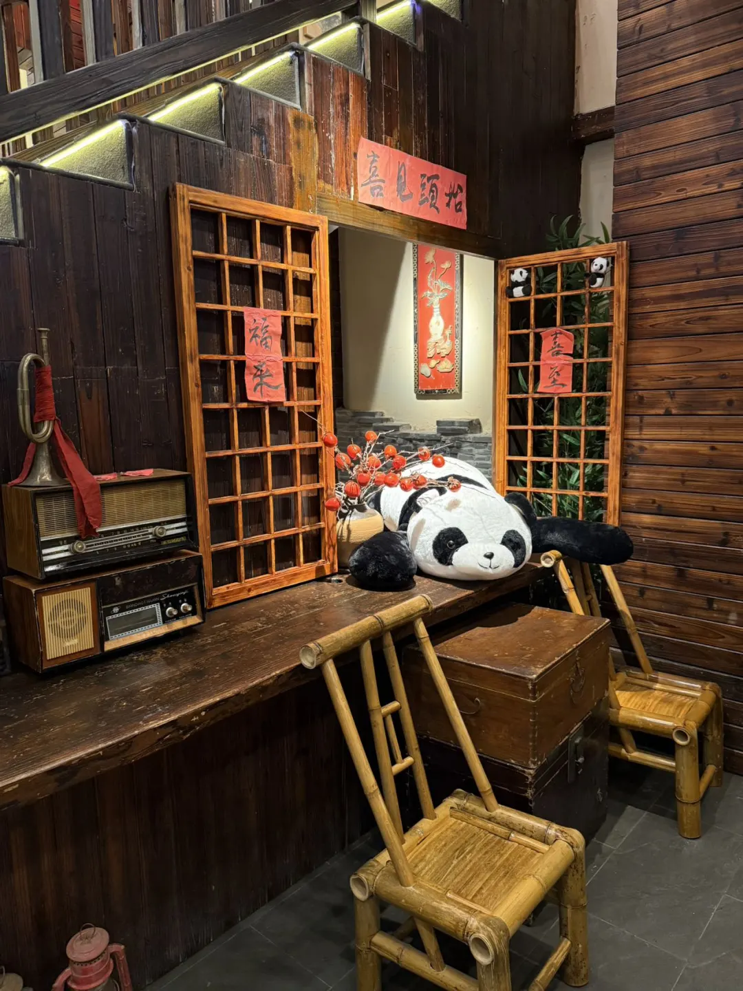 一进门就被拿捏了!木质新中式装修,红灯笼、木格栅、熊猫摆件随处可见,氛围感直接拉满!