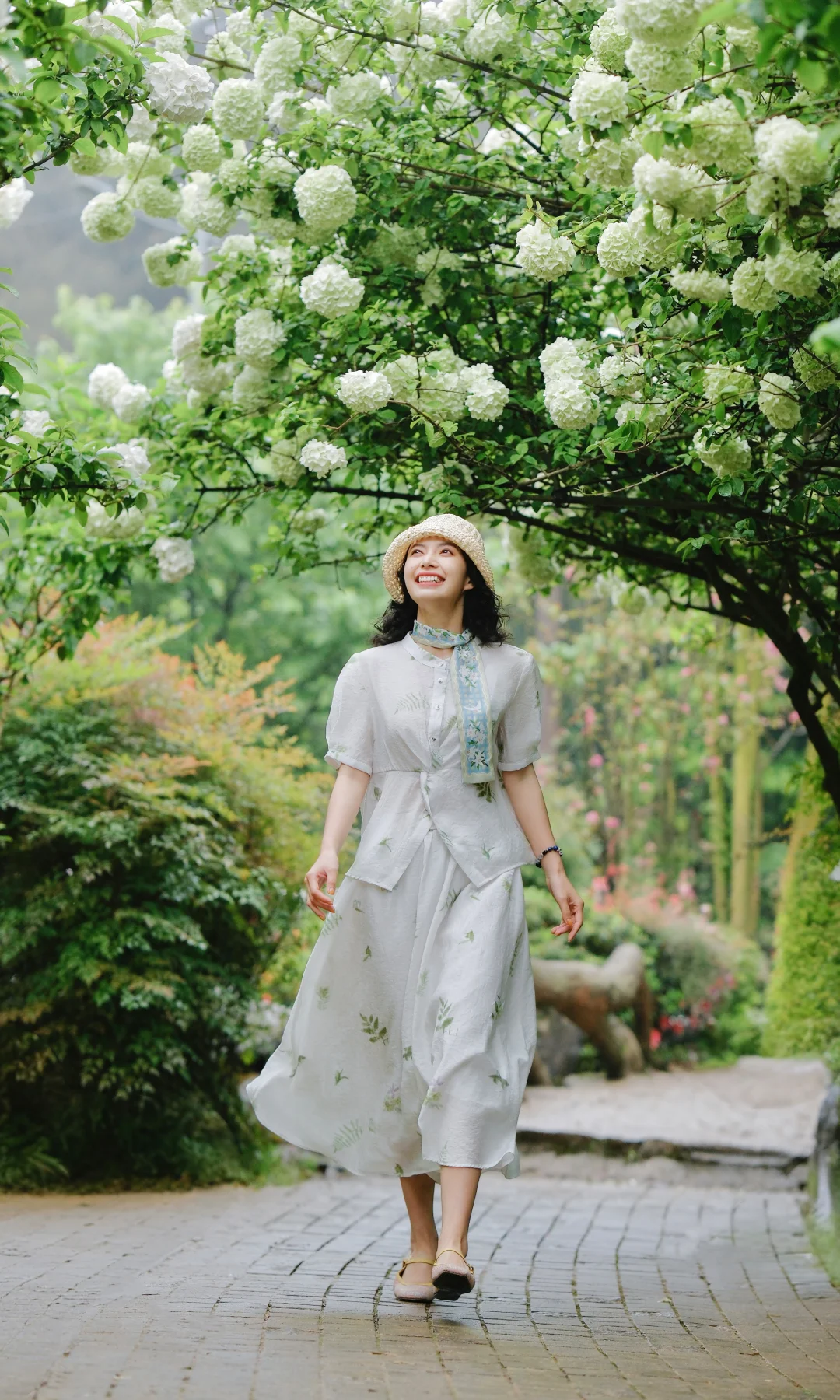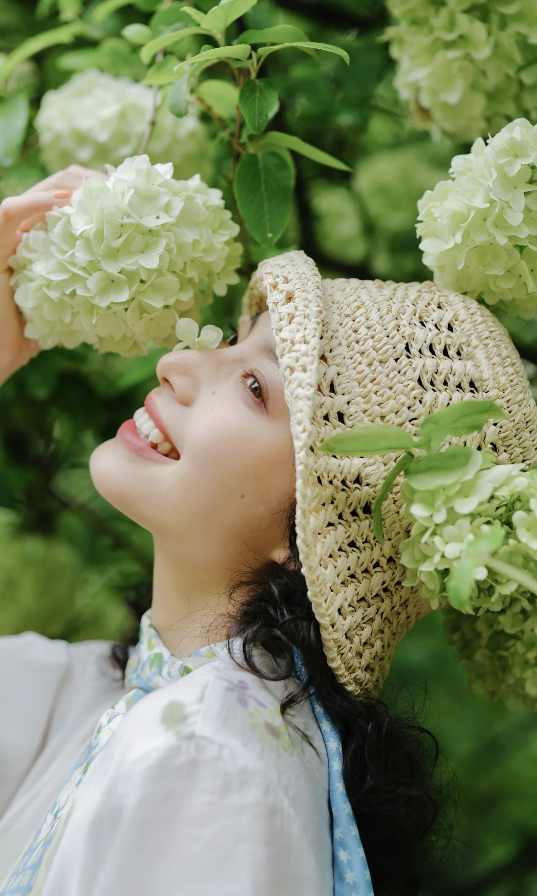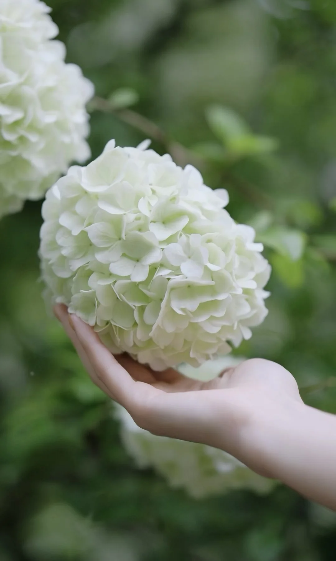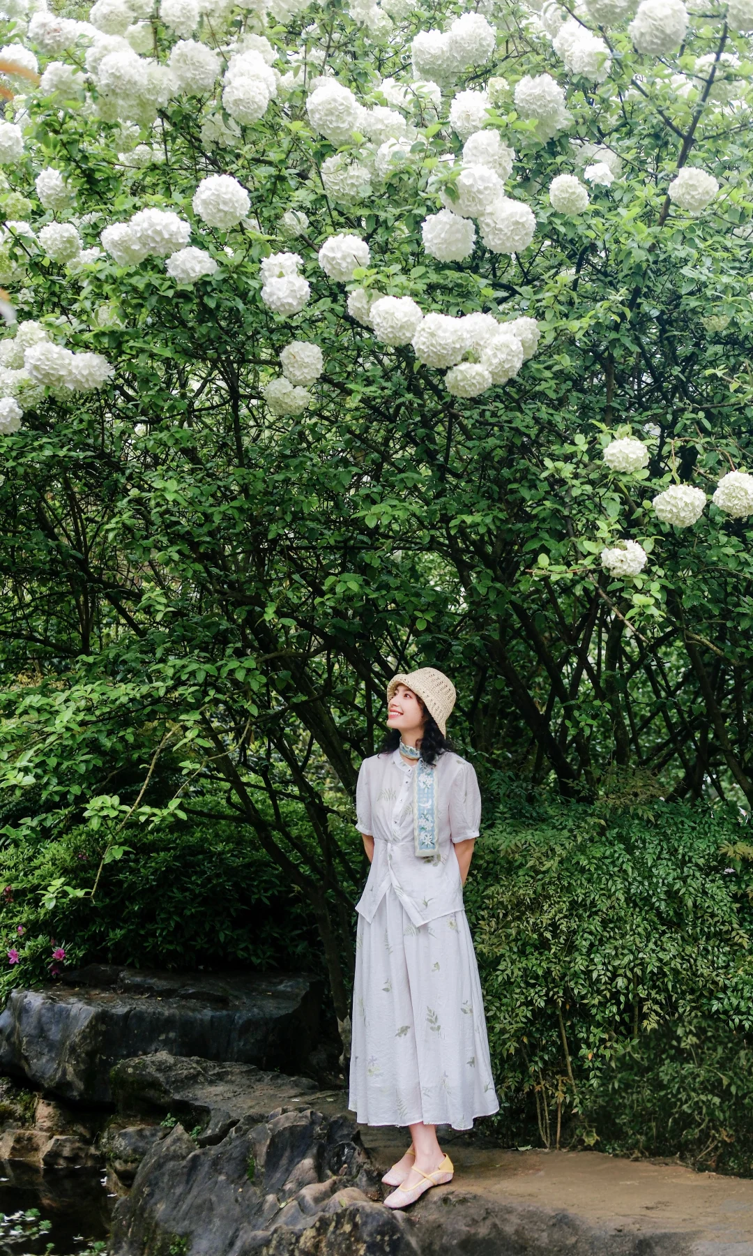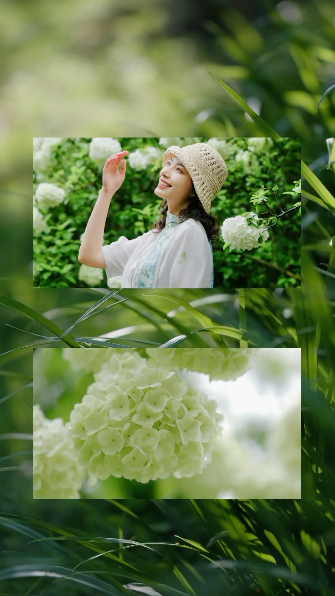 1️⃣站在大棵的绣球花下,前后走动,低机位拍摄,能尽可能多地拍到绣球的花冠