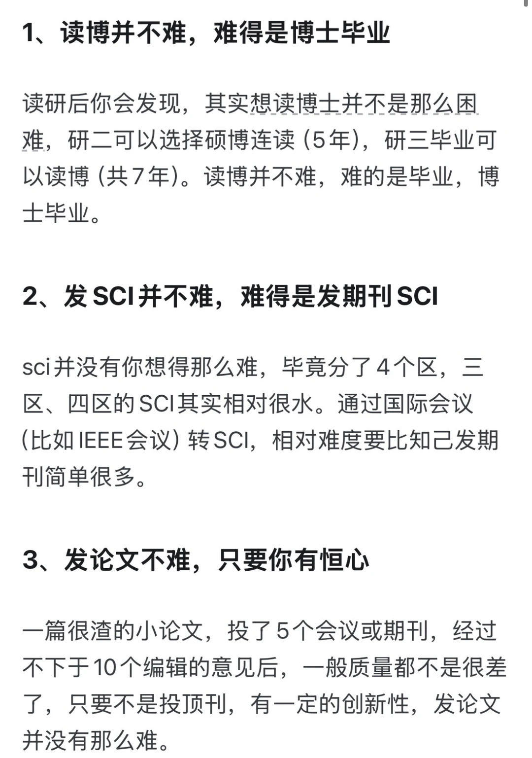 读研后你会发现,其实想读博士并不是那么困难,研二可以选择硕博连读(5年),研三毕业可以读博(共7年)。读博并不难,难的是毕业,博土毕业。