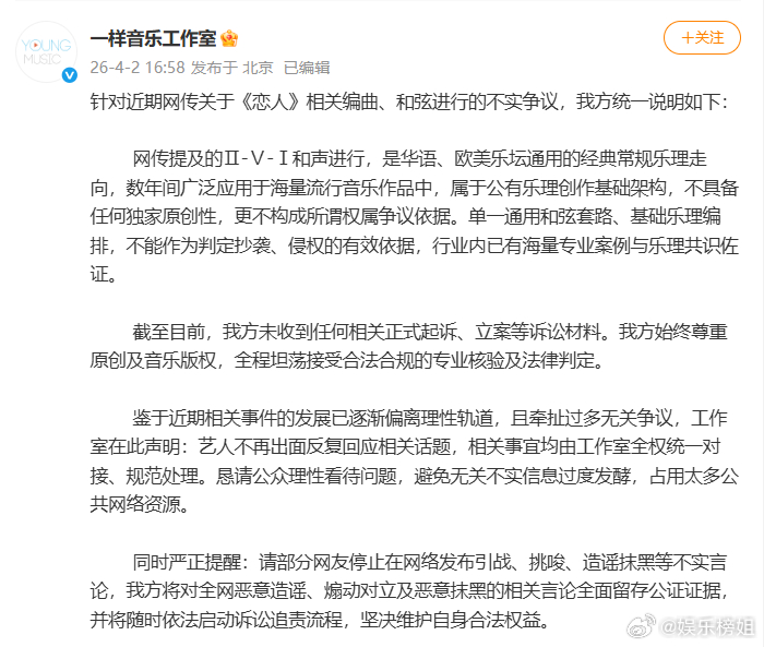 李荣浩方回应 李荣浩工作室刚刚发文回应了《恋人》抄袭争议,表示网传提及的Ⅱ-Ⅴ-Ⅰ和声进行,是乐坛通用的经典常规乐理走向,不能以此判定抄袭,并表示他们未收到任何相关正式起诉、立案等诉讼材料。故意带节奏的人可以散了 李荣浩方否认恋人抄袭