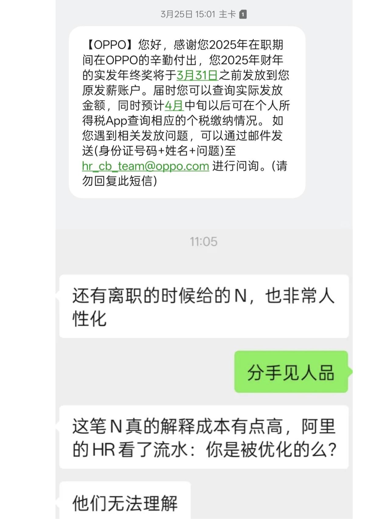 刷到有人离职还能拿年终奖,我承认我酸了🍋 刷🍠刷到个大瓜,直接给我看愣了🤯 近期大厂裁员补偿话题刷屏,大家懂的都懂 - 结果有网友晒贴说OPPO员工离职了也能拿年终奖+补偿大礼包! 不管主动走还是被动优化,年终奖都按比例发 而且补偿礼包也给得很到位,未休年假直接折现 离职流程一点不卡...... 这真的把我给惊住了😺 - 👀说实话,这真的是我没想到的 在现在这个环境下,很多公司连在职员工的年终奖都各种克扣 OPPO还能想着已经离开的员工 这份诚信和格局真的让人respect。 难怪大家都想冲大厂,各种福利待遇是真好…… - 而且这种“说到做到”的公司文化确实值得点赞 不管你是不是OPPO粉,离职还按规矩给钱这件事 👏至少说明这家企业有诚信、有底线 虽然我不是OPPO员工 但这一刻,我是真的羡慕了…… 又是为别人家公司流泪的一天😭
