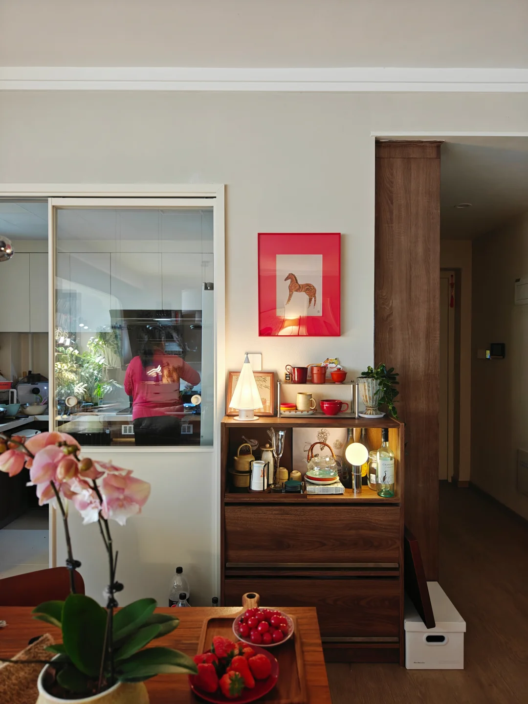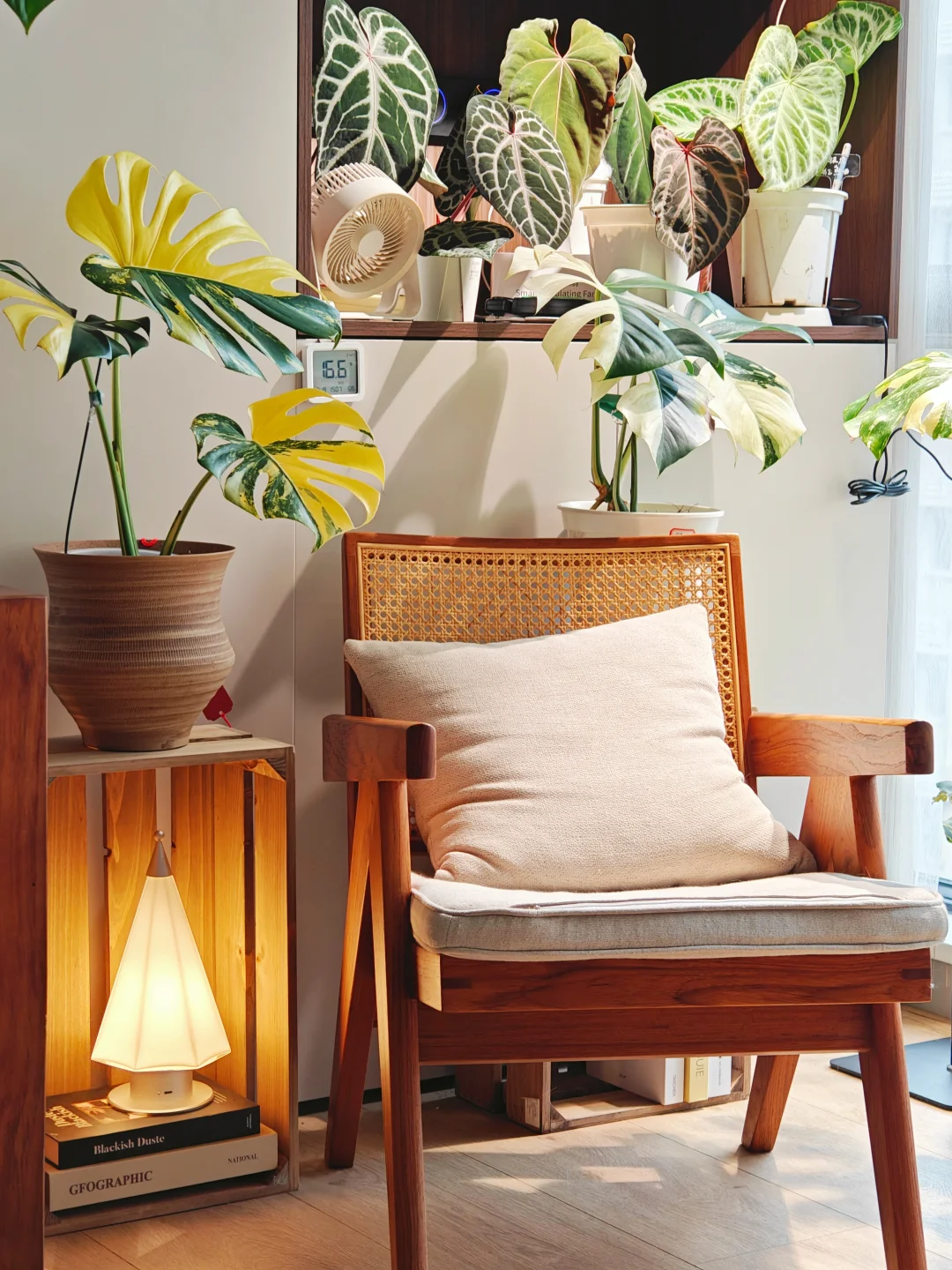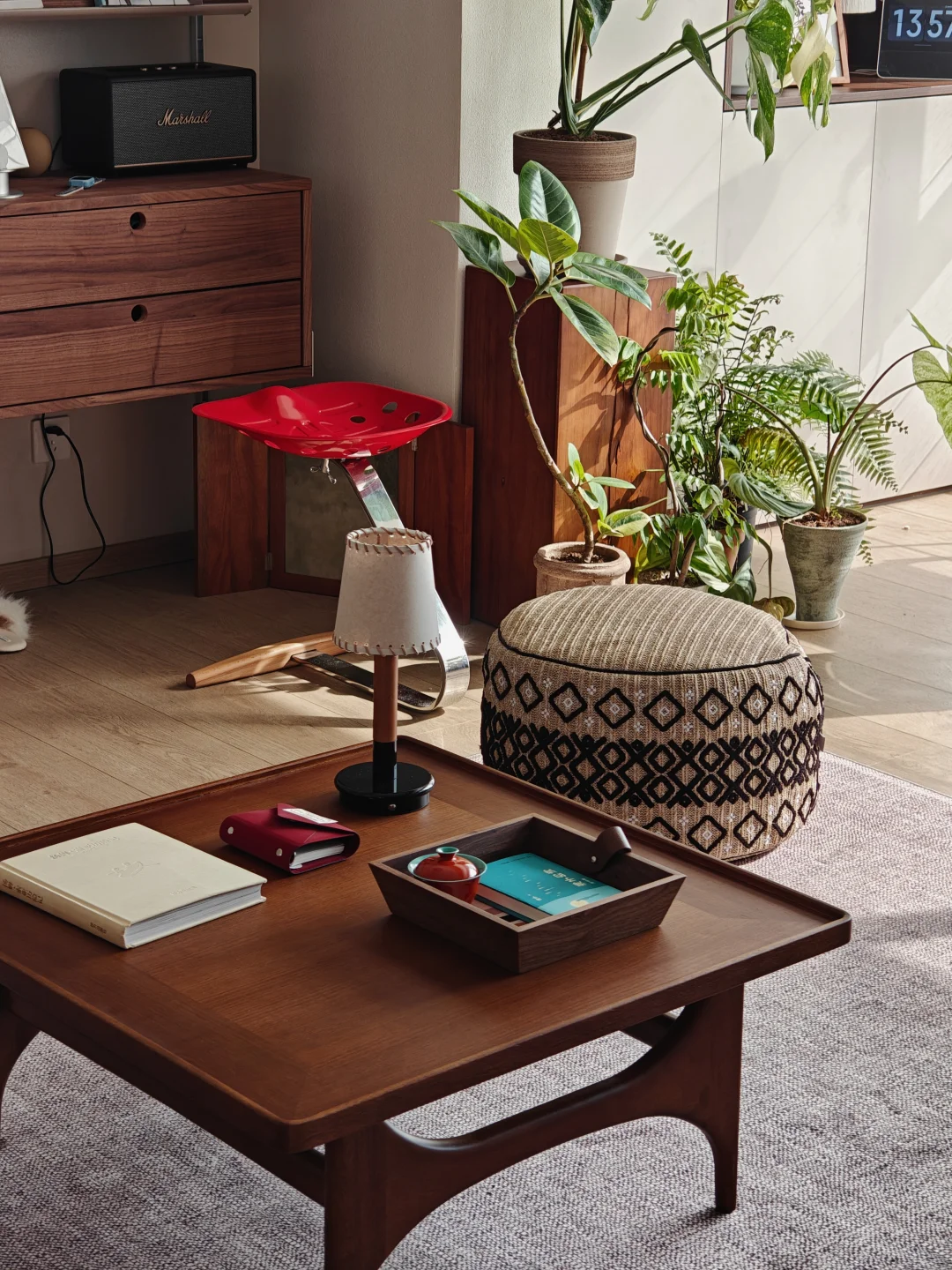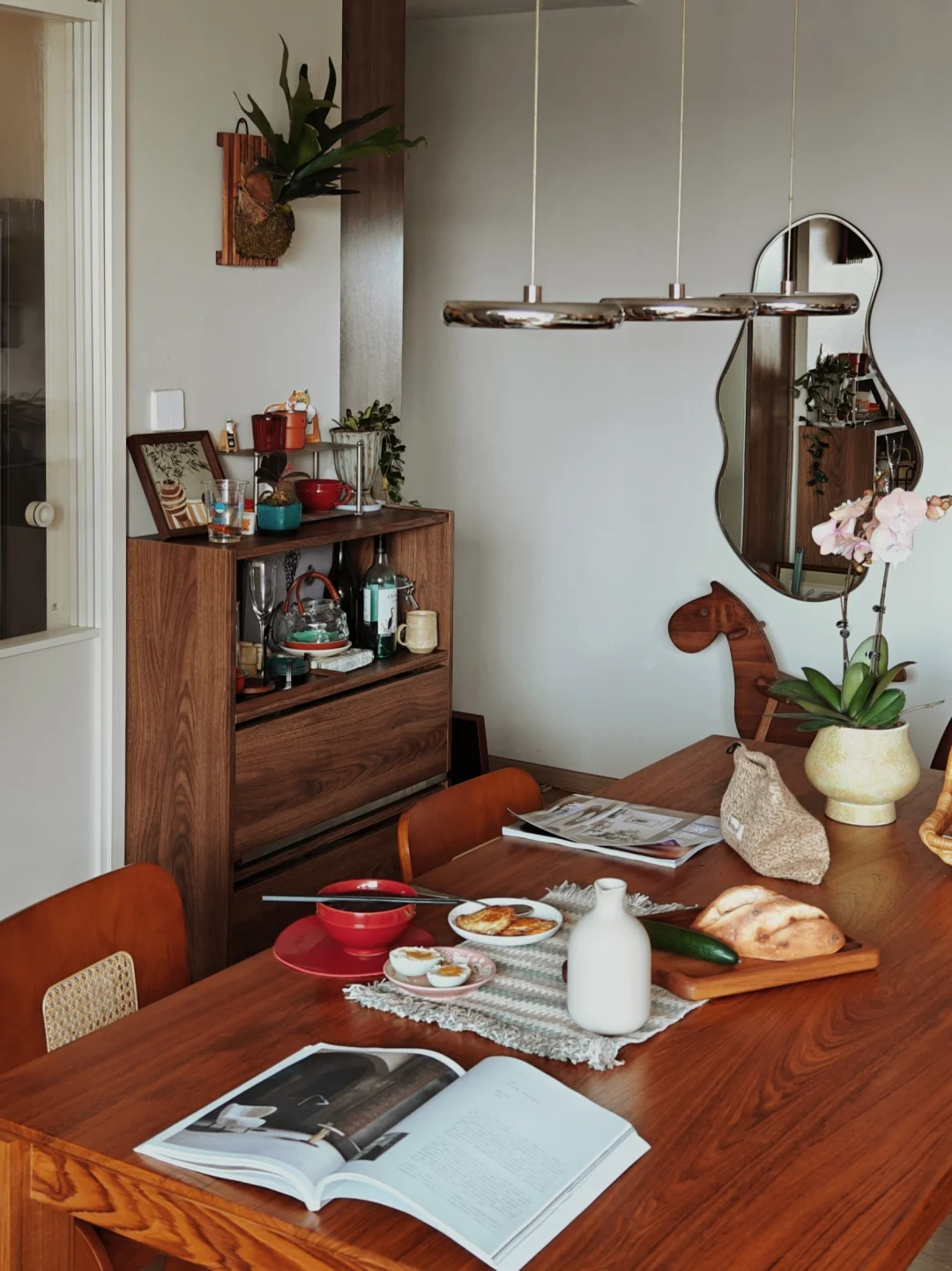 - 70%木质感:选1-2种主木材(我用了柚木和黑胡桃),通过柜子、椅子、隔板来体现,统一又不单调。