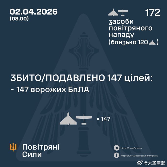 乌军防空部队击落来袭的俄军172架无人机中的147架。关注俄乌局势最新进展俄乌冲