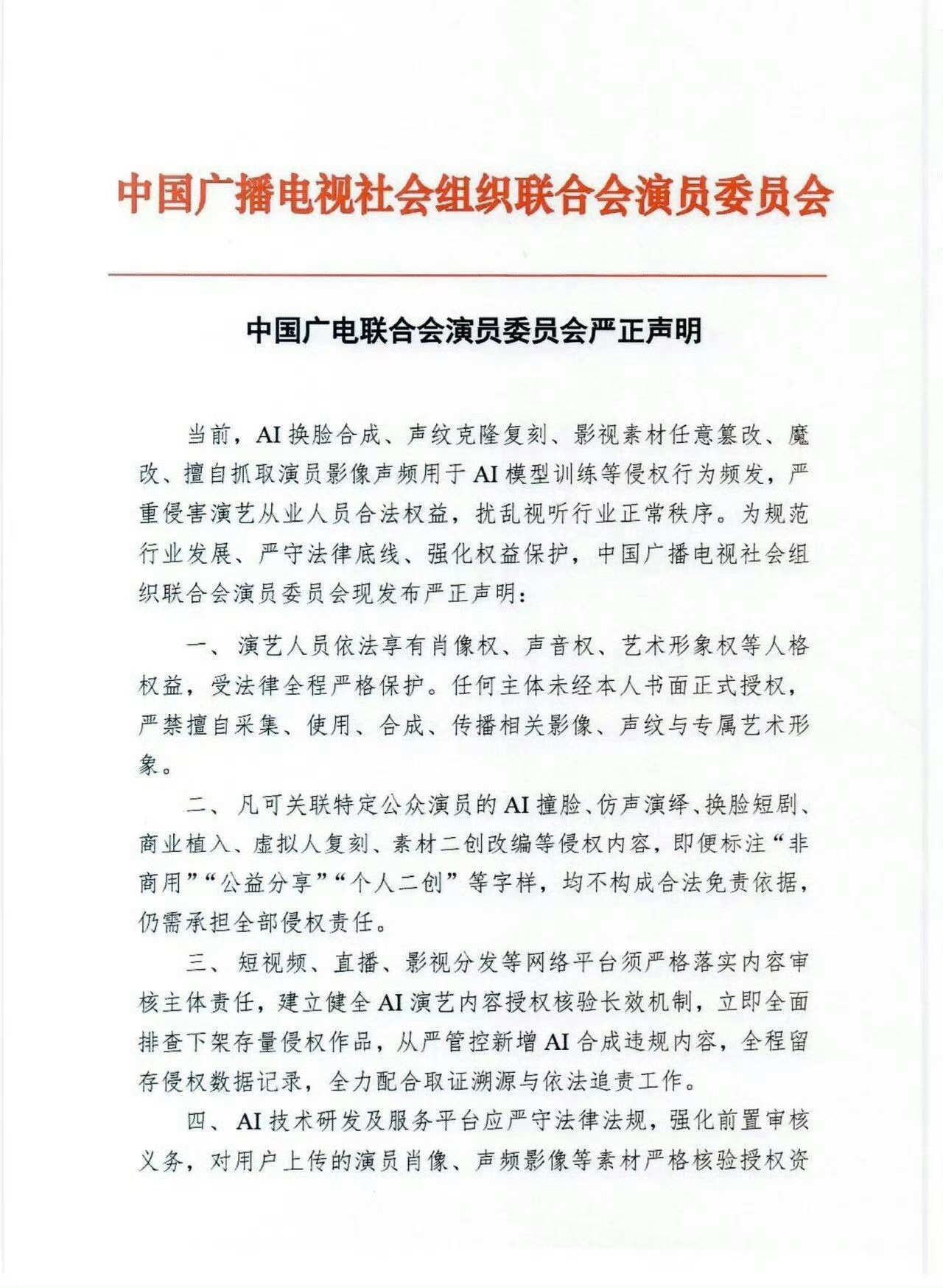 广电社会组织联合会演员委员会发文:严格管控AI的影视化侵权市场,保障演员肖像权、声音权等权利