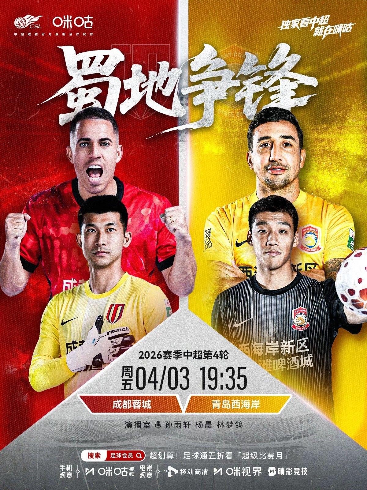 𝑪𝑺𝑳 《蜀地争锋》⚽️ 2026中超联赛第四轮🏟️ 成都蓉城 对阵 青岛西海岸⏰ 4/3周五 19:35 准时收看👀 #成都蓉城vs青岛西海岸##独家看中超就在咪咕#网页链接