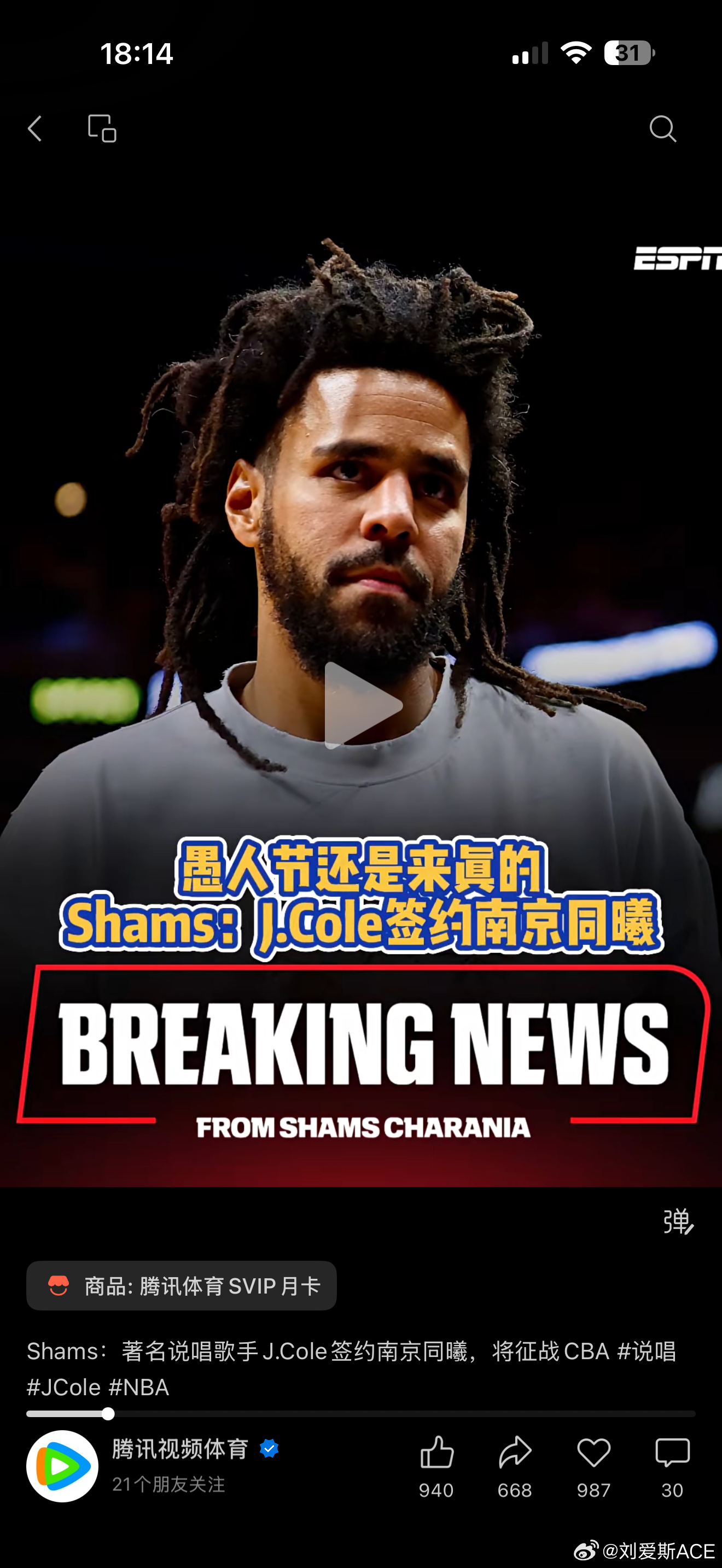 说唱歌手JCole加盟CBA反正给我吓到了 原来是真的 以后看CBA能看见他了屌惨 yesir~